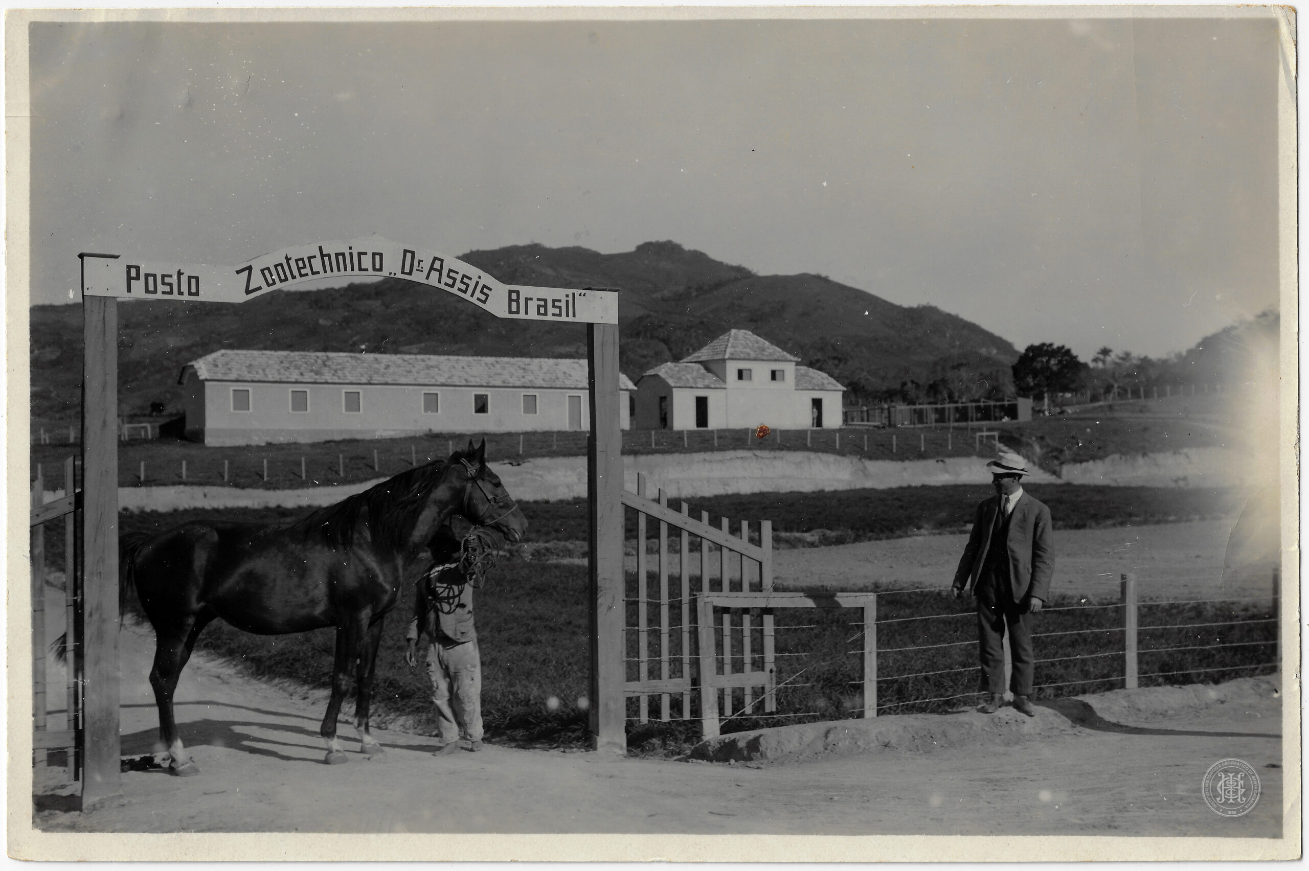 Entrada do Posto Zootecnico "Dr. Assis Brasil", fundado em fevereiro de 1920 no governo Dr. Hercilio Luz, situado no Bairro Carvoeira, em Florianópolis. No primeiro plano, à esquerda, um homem segura as rédeas de um cavalo de pelagem escura, posicionado de perfil à frente de um portal de madeira que sustenta uma placa com a inscrição "Posto Zootecnico Dr. Assis Brasil". À direita, um homem trajado de terno e chapéu permanece em pé junto a uma cerca de arame e madeira. O solo em primeiro plano é de terra batida, apresentando uma via que atravessa o portal.