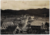 Destacam-se edificações de madeira e alvenaria com telhados de duas águas, dispostas de forma esparsa entre áreas de pastagem e cultivo. Ao fundo, a paisagem é dominada por uma sucessão de morros e elevações cobertos por vegetação arbórea densa sob um céu claro. Integrada organicamente no canto inferior esquerdo do anverso, consta a legenda impressa: "Vista parcial do povoado de SERRA ALTA no município do Rio do Sul".