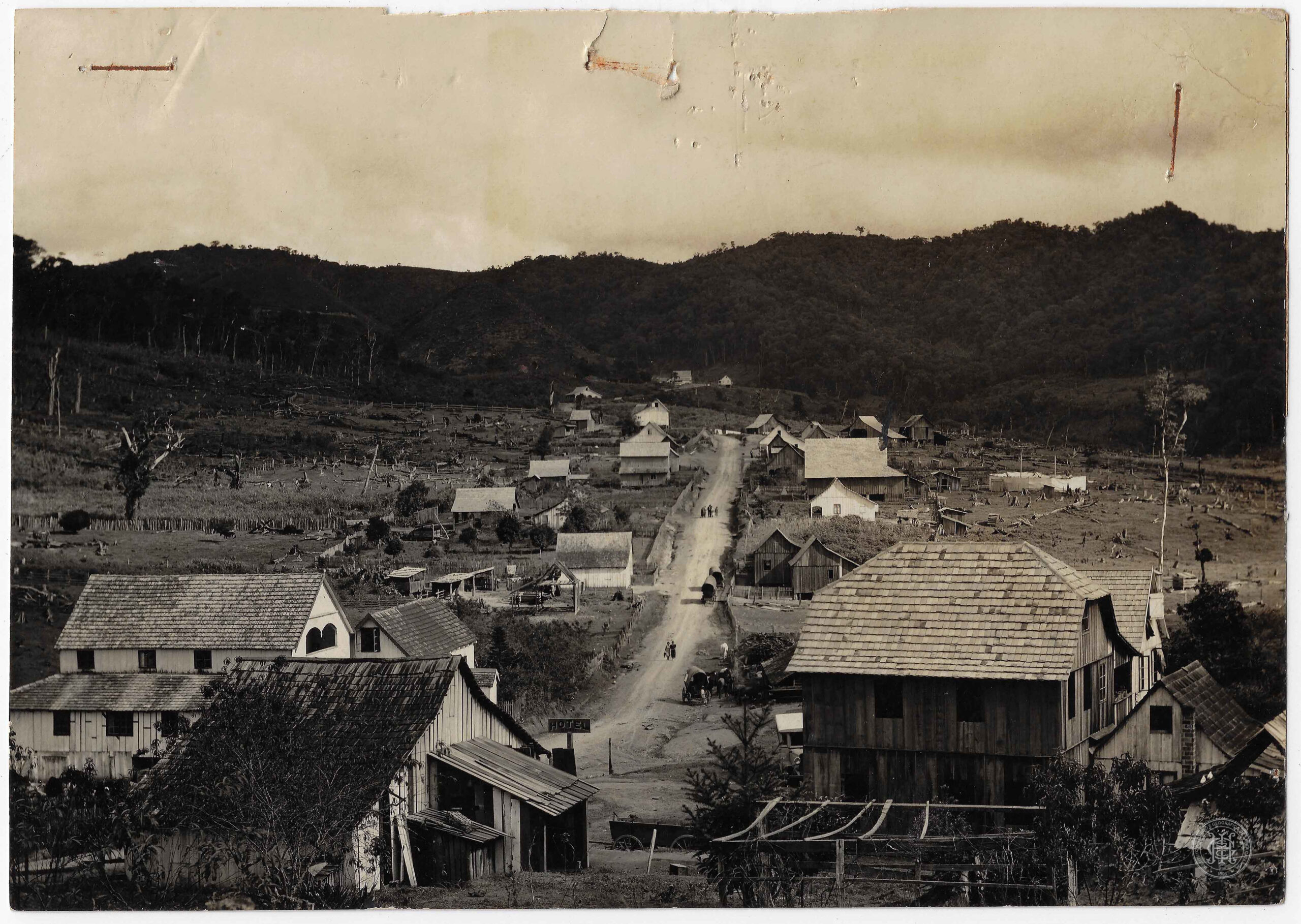 Vista parcial do povoado de Serra Alta, no município de Rio do Sul, Santa Catarina. A composição organiza-se a partir de um terreno com vegetação baixa e arbustos em primeiro plano, que se estende até o plano médio, onde se observa o núcleo habitacional.