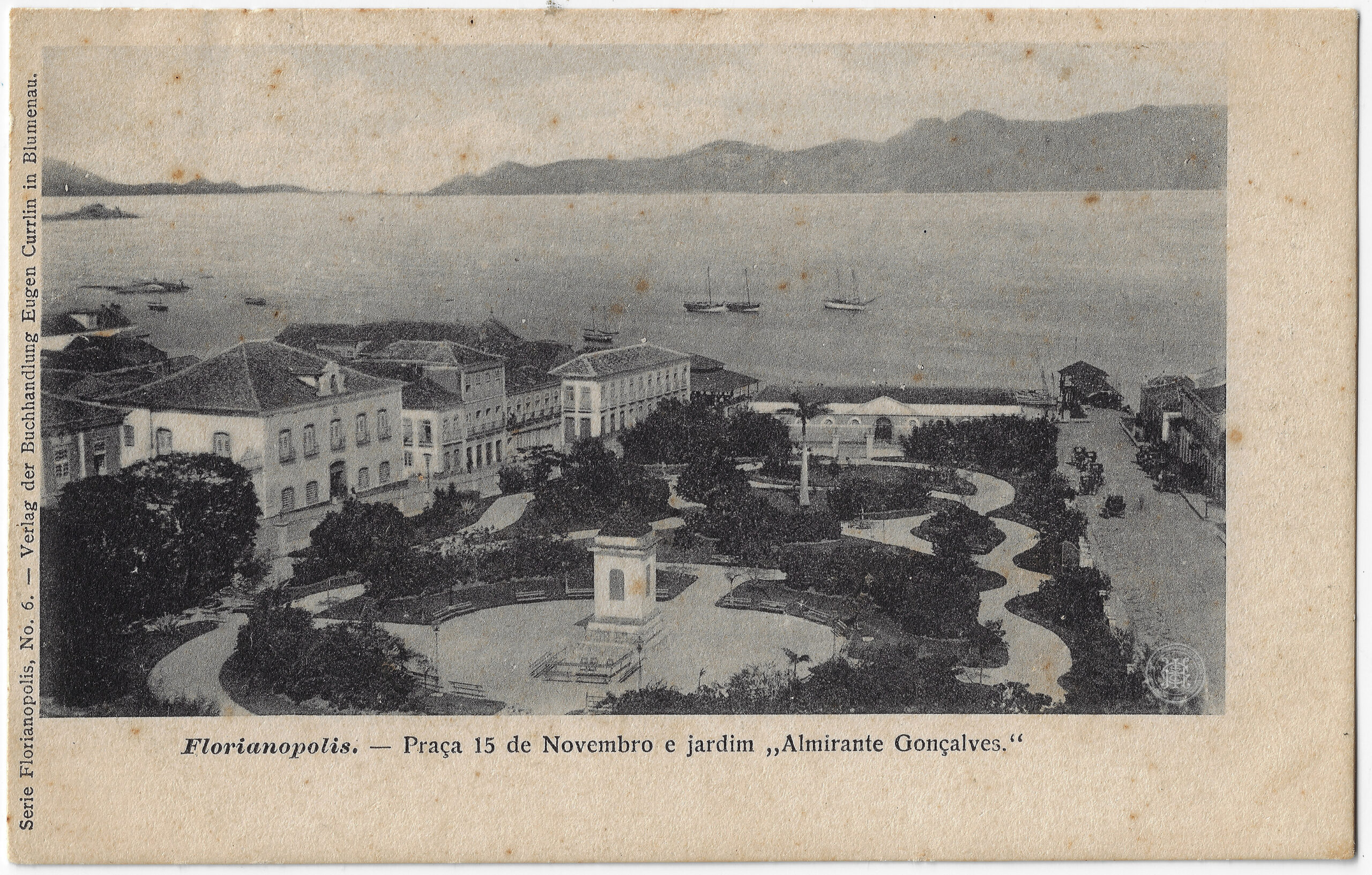 Frente: Serie Florianopolis, No. 6. — Verlag der Buchhandlung Eugen Currlin in Blumenau. Florianopolis. — Praça 15 de Novembro e jardim „Almirante Gonçalves.“