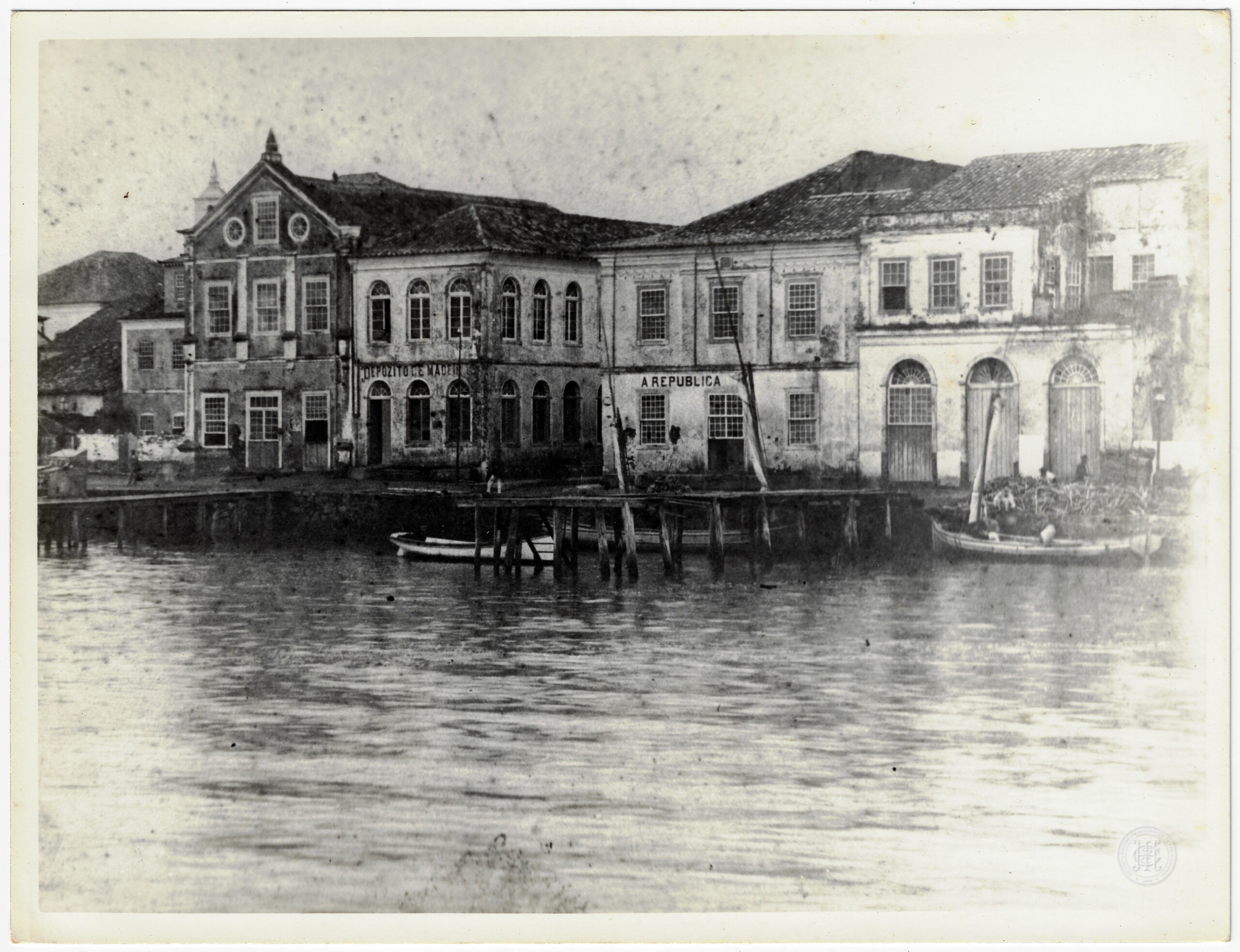 Adjacente a ele, uma edificação traz a inscrição pintada "DEPOZITO DE MADEIR" sobre as portas do térreo, em um prédio que posteriormente abrigaria o IPESC. No centro da composição, destaca-se o prédio onde funcionava o jornal "A REPUBLICA", com a inscrição homônima visível na fachada clara de dois pavimentos. À direita, seguem-se armazéns com grandes portas em arco pleno no nível da rua, típicos da zona portuária comercial da época. O plano de fundo revela telhados cerâmicos e outras construções que se estendem pela malha urbana.