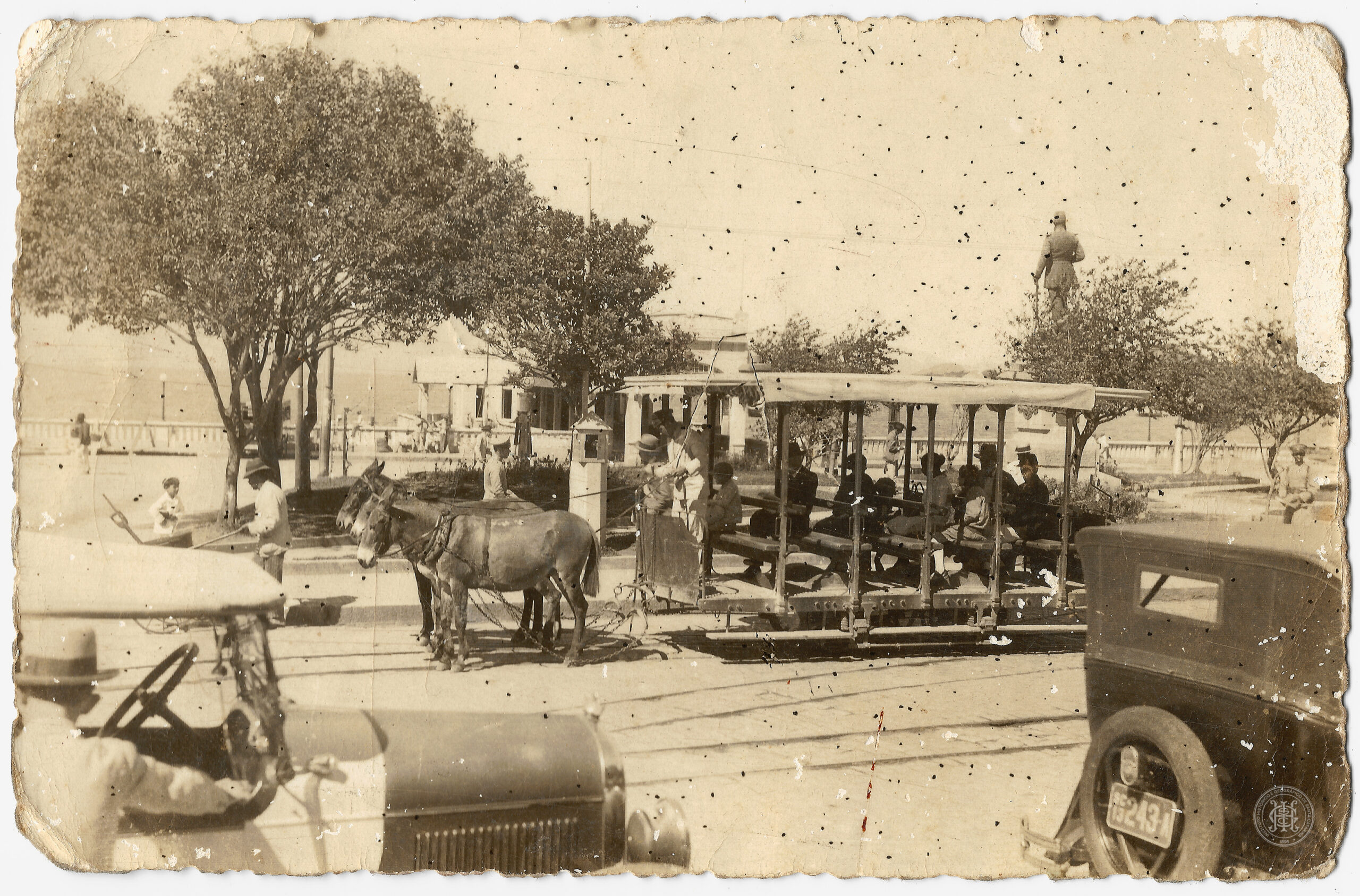 Uma cena cotidiana na Praça Fernando Machado, em Florianópolis, Santa Catarina, no ano de 1930. Em primeiro plano, à esquerda e à direita, observam-se partes de veículos motorizados de passeio, com um motorista visível ao volante do automóvel à esquerda. No plano médio, o elemento central é um bonde aberto da companhia Carros Urbanos e Suburbanos de Florianópolis, tracionado por dois burros e ocupado por diversos passageiros sentados em bancos transversais; o condutor do bonde permanece em pé na plataforma dianteira. Ao fundo, a composição revela a arborização da praça, o trapiche municipal Miramar e, à direita, o monumento com a estátua de Fernando Machado sobre um pedestal.