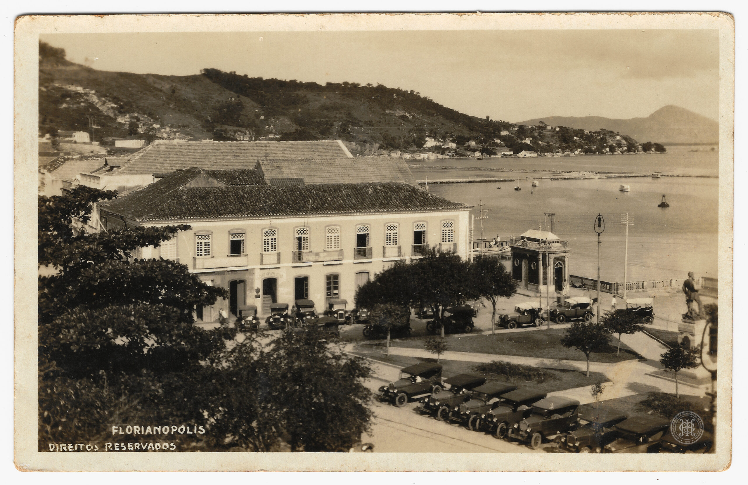 Praça Fernando Machado em Florianópolis, Santa Catarina, no ano de 1927. No primeiro plano, à esquerda, observa-se a copa de uma árvore densa que emoldura a cena, enquanto no centro e à direita há uma fileira de automóveis de época estacionados em ângulo, voltados para a praça. No plano médio, destaca-se um imponente sobrado de dois pavimentos com telhado de telhas cerâmicas e múltiplas aberturas simétricas no piso superior, diante do qual outros veículos estão estacionados. À direita deste edifício, localiza-se o mictório público, uma pequena estrutura ornamental de arquitetura eclética que posteriormente viria a abrigar o Museu do Saneamento.