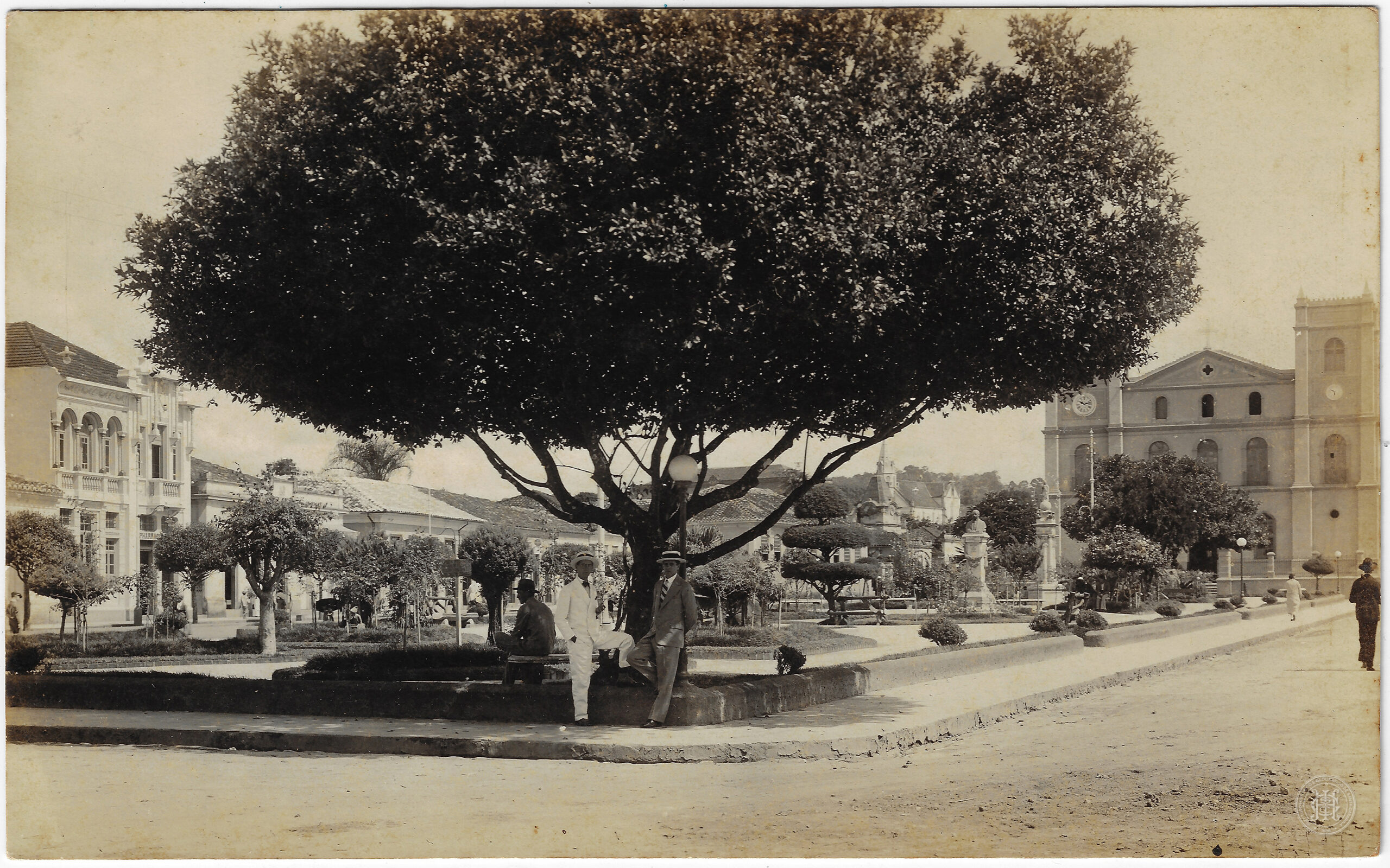 Esta fotografia registra uma vista da Praça Senador José Bento e do jardim público em Pouso Alegre, Minas Gerais. No primeiro plano, à esquerda, observa-se o início de um canteiro gramado delimitado por meio-fio baixo e uma calçada clara. No plano médio, centralizada, destaca-se uma árvore de grande porte com copa densa e arredondada, sob a qual dois homens trajando ternos e chapéus estão posicionados: um à esquerda, com terno claro, sentado no murete do canteiro, e outro à direita, com terno escuro, em pé e encostado no tronco. À esquerda da árvore, o cenário urbano exibe um casario histórico com sobrados de arquitetura eclética, caracterizados por vãos em arco pleno e balcões com balaustrada.
