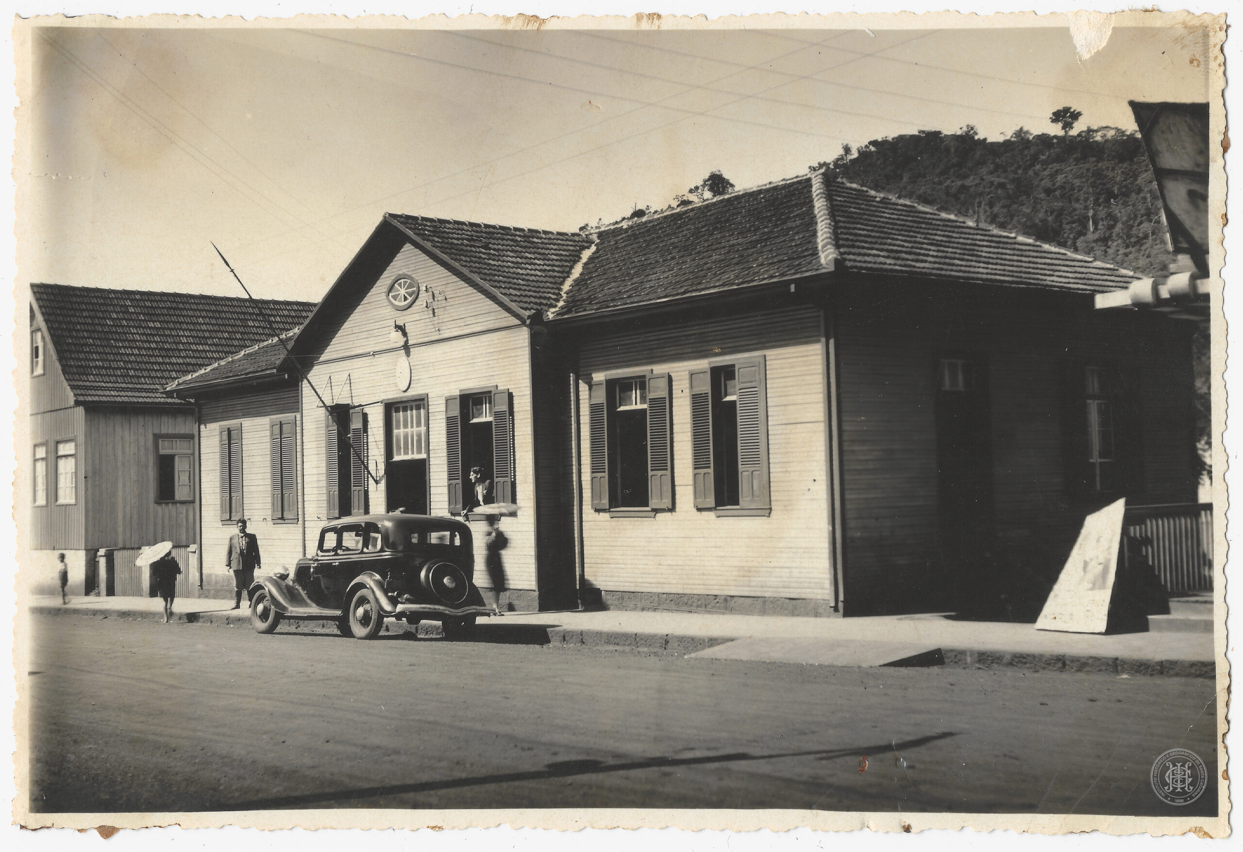 A fachada principal exibe uma sequência de janelas retangulares de verga reta em ambos os pavimentos. Em primeiro plano, a via pública de terra batida destaca um automóvel de passeio da década de 1940 estacionado diretamente à frente da entrada principal.