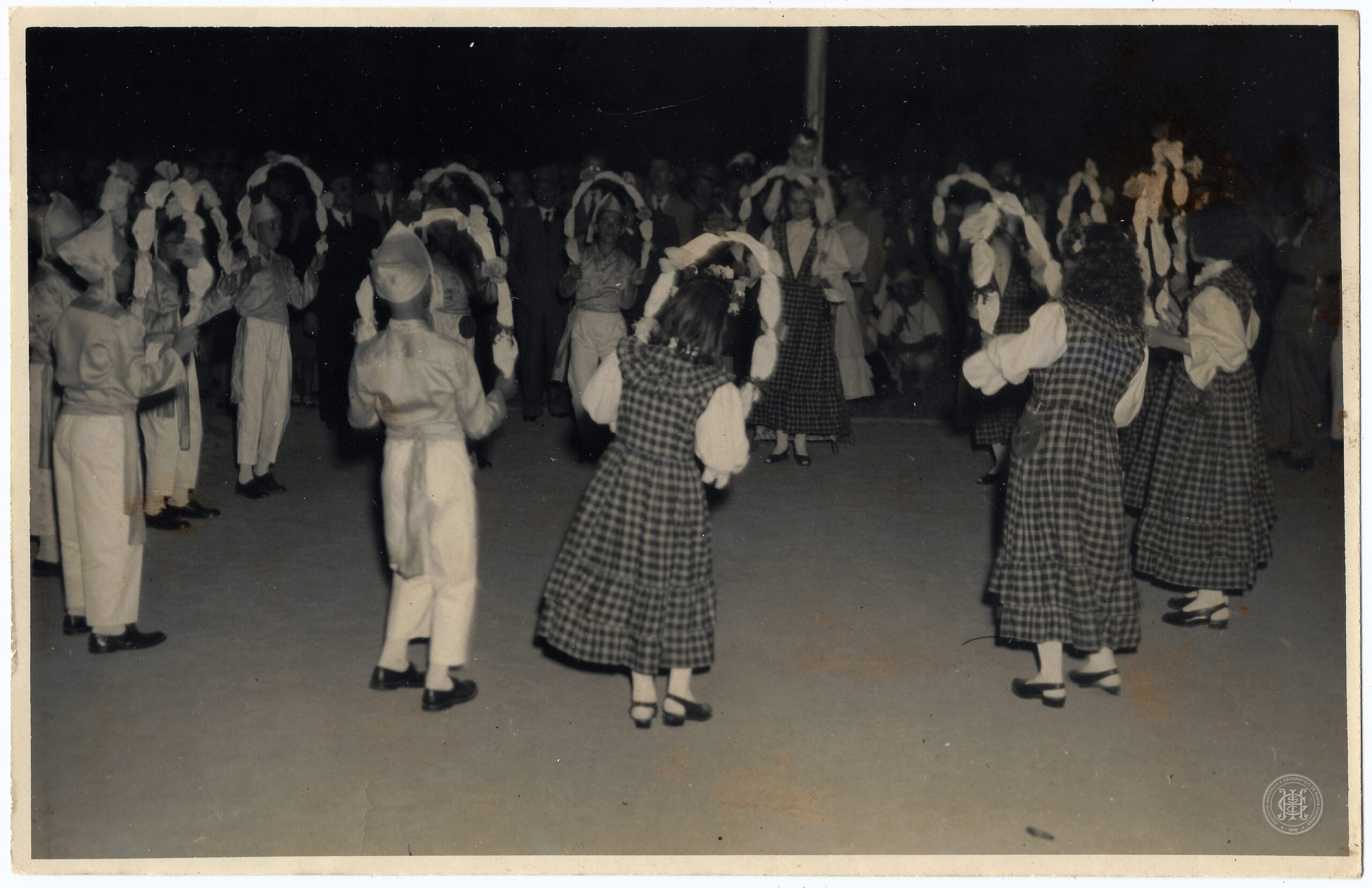 Apresentação da "Dança do Cupido e da Jardineira", realizada na noite de 8 de outubro de 1948, no estádio da Polícia Militar do Estado, em Florianópolis, Santa Catarina. O evento integrou a programação cultural do Primeiro Congresso de História Catarinense, em comemoração ao segundo centenário da colonização açoriana. A imagem, capturada em plano médio, apresenta um grupo de crianças e jovens figurantes organizados em círculo sobre o piso pavimentado. No primeiro plano, de costas para a câmera, observa-se uma menina vestindo um vestido de padronagem xadrez com mangas bufantes claras e um menino com calças e camisa claras, usando um chapéu cônico.