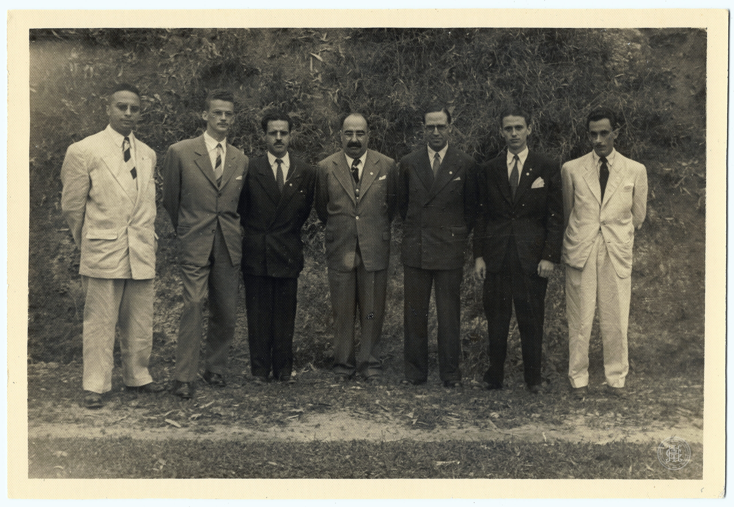 A indumentária de todos os integrantes é formal, composta por ternos completos com paletós de diferentes tonalidades, camisas de colarinho rígido e gravatas escuras. Destacam-se dois homens nas extremidades (esquerda e direita) utilizando paletós de cores claras, enquanto os demais portam tons médios e escuros. No plano de fundo, observa-se um barranco ou encosta coberta por vegetação densa e desordenada, composta por arbustos e folhagens secas, que serve de pano de fundo natural para o grupo. A iluminação é natural e frontal, realçando as texturas dos tecidos e as fisionomias dos retratados, que mantêm posturas solenes, mãos atrás das costas e olhar direcionado à câmera.
