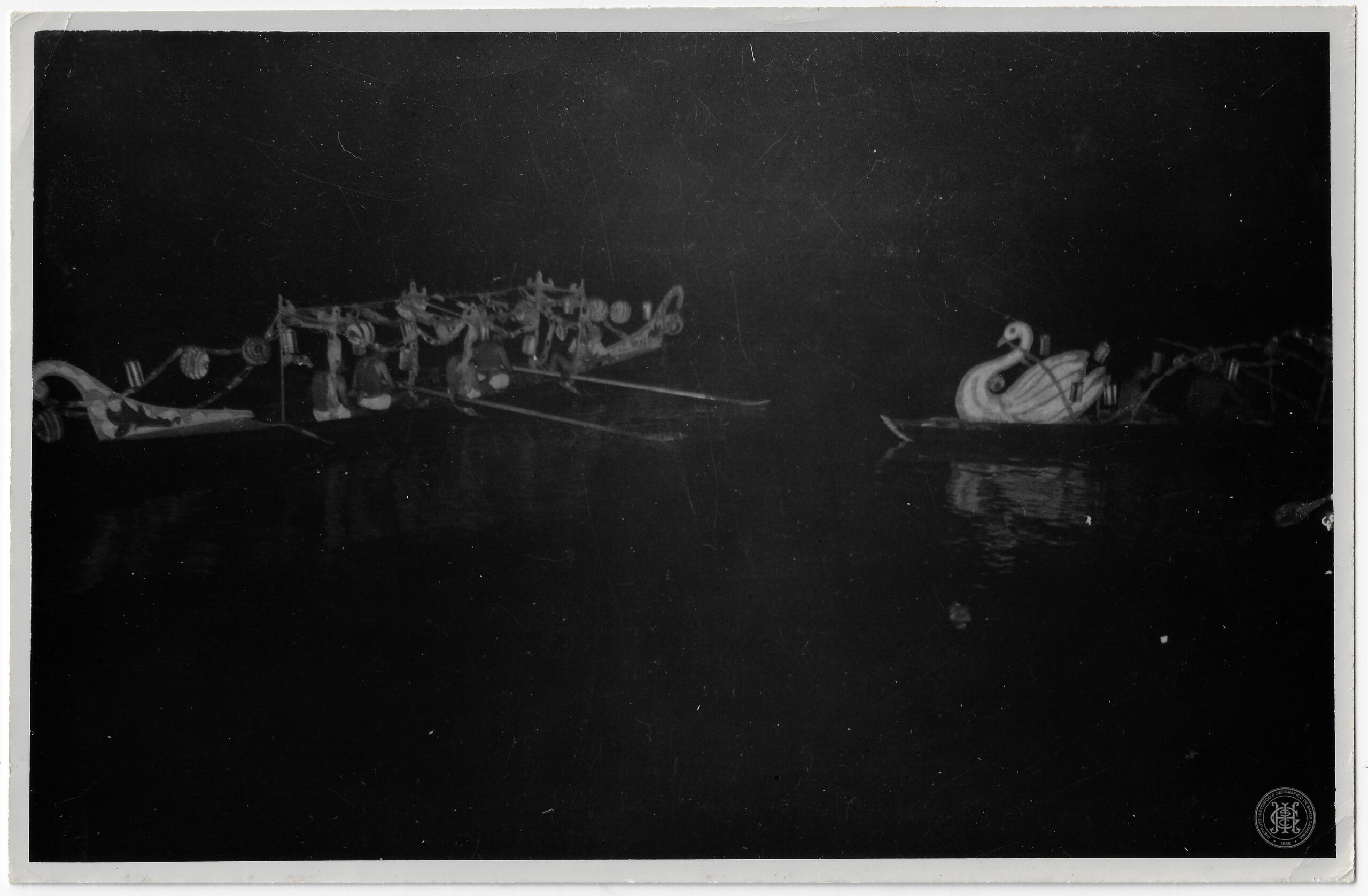 Registra uma cena noturna aquática em Florianópolis, Santa Catarina, em outubro de 1948, como parte das festividades do Primeiro Congresso de História Catarinense e do bicentenário da colonização açoriana. Em primeiro plano, a superfície da água reflete suavemente as luzes e formas das embarcações. À direita, destaca-se uma embarcação de pequeno porte ostentando uma grande alegoria em formato de cisne branco, com o pescoço curvado, adornada com pequenas lanternas ou luzes dispostas ao longo de sua estrutura.