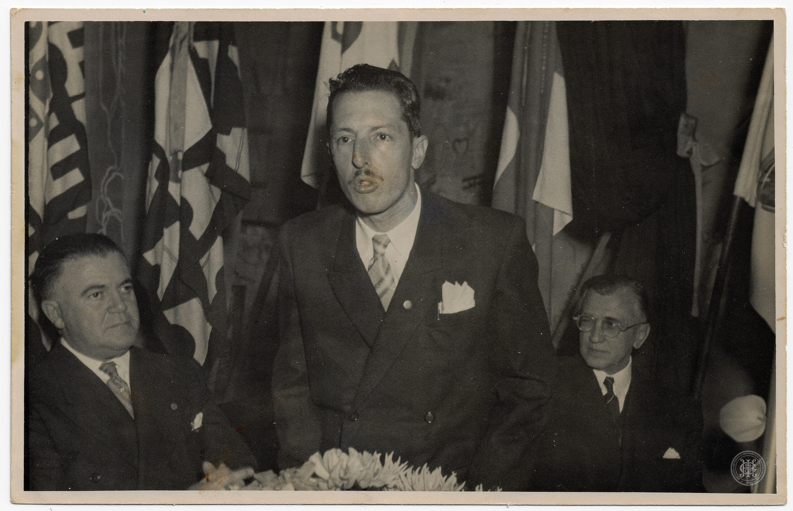 Registra a sessão de encerramento do Primeiro Congresso de História Catarinense, realizada em 12 de outubro de 1948, em Florianópolis, Santa Catarina. Em plano médio e centralizado, o Deputado Antônio Nunes Varela é retratado em pé, em postura de oração ou leitura, com a boca semiaberta, indicando a ação de proferir um discurso. Ele veste um terno escuro de abotoamento duplo, camisa clara, gravata listrada e exibe um lenço claro no bolso superior esquerdo do paletó, além de um pequeno distintivo na lapela. À sua direita, sentado em primeiro plano, observa-se o Desembargador José Rocha Ferreira Bastos, de cabelos escuros, vestindo terno e gravata, com o olhar direcionado para a frente. À esquerda do orador, também sentado, encontra-se o Dr. Carlos Gomes de Oliveira, que utiliza óculos de armação clara e trajes formais escuros.
