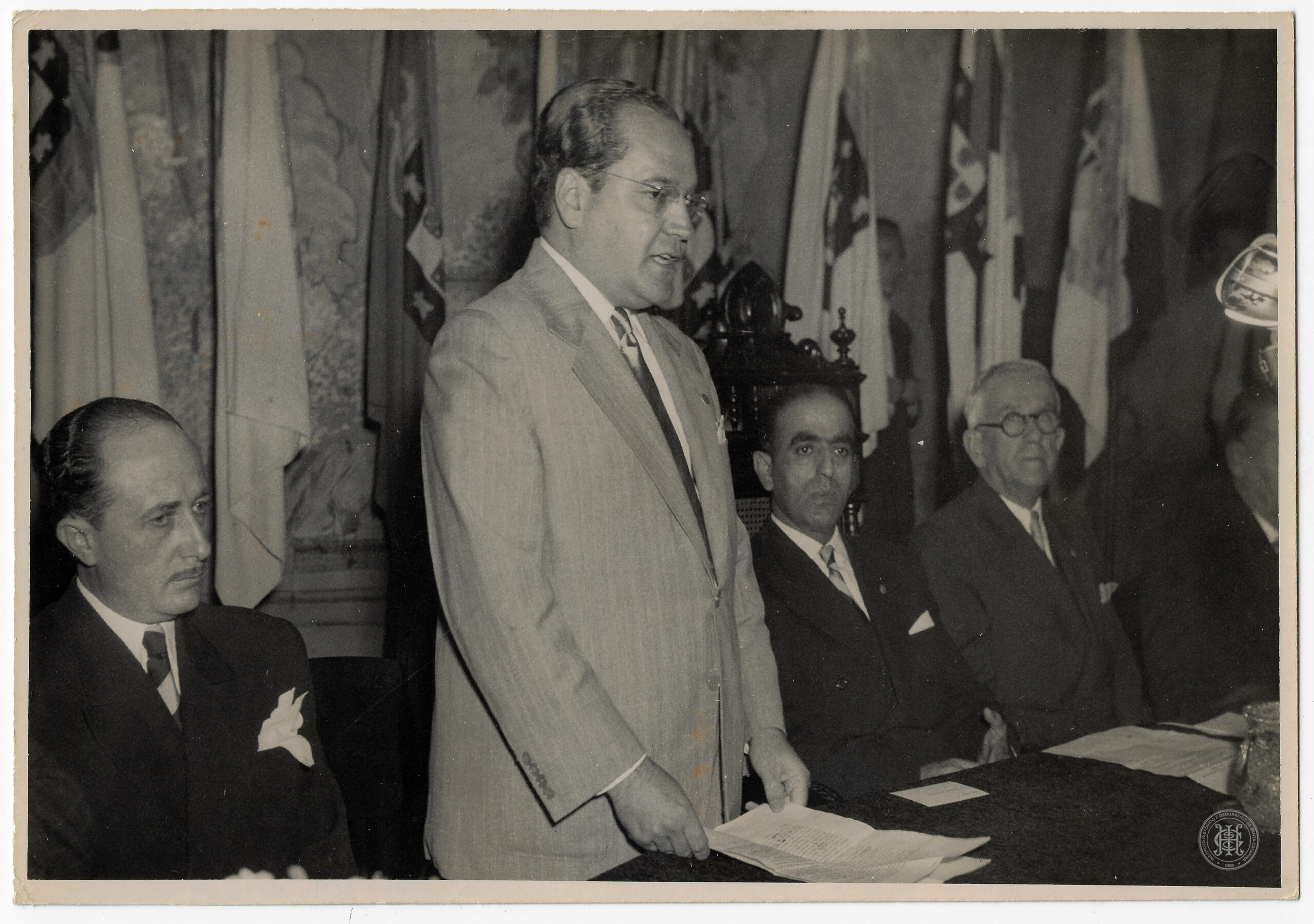 Primeiro Congresso de História Catarinense, Hélio Vianna, José Boabaid, Lucas Boiteux, Saulo Ramos, Florianópolis, Santa Catarina, Evento Político, Evento Cultural, Sessão Legislativa, Autoridades, Governador, Comandante, Discurso, Solenidade, História de Santa Catarina, Retrato Coletivo, Fotografia Documental, Século XX, 1948, Colonização Açoriana, Traje Formal, Mesa Diretora