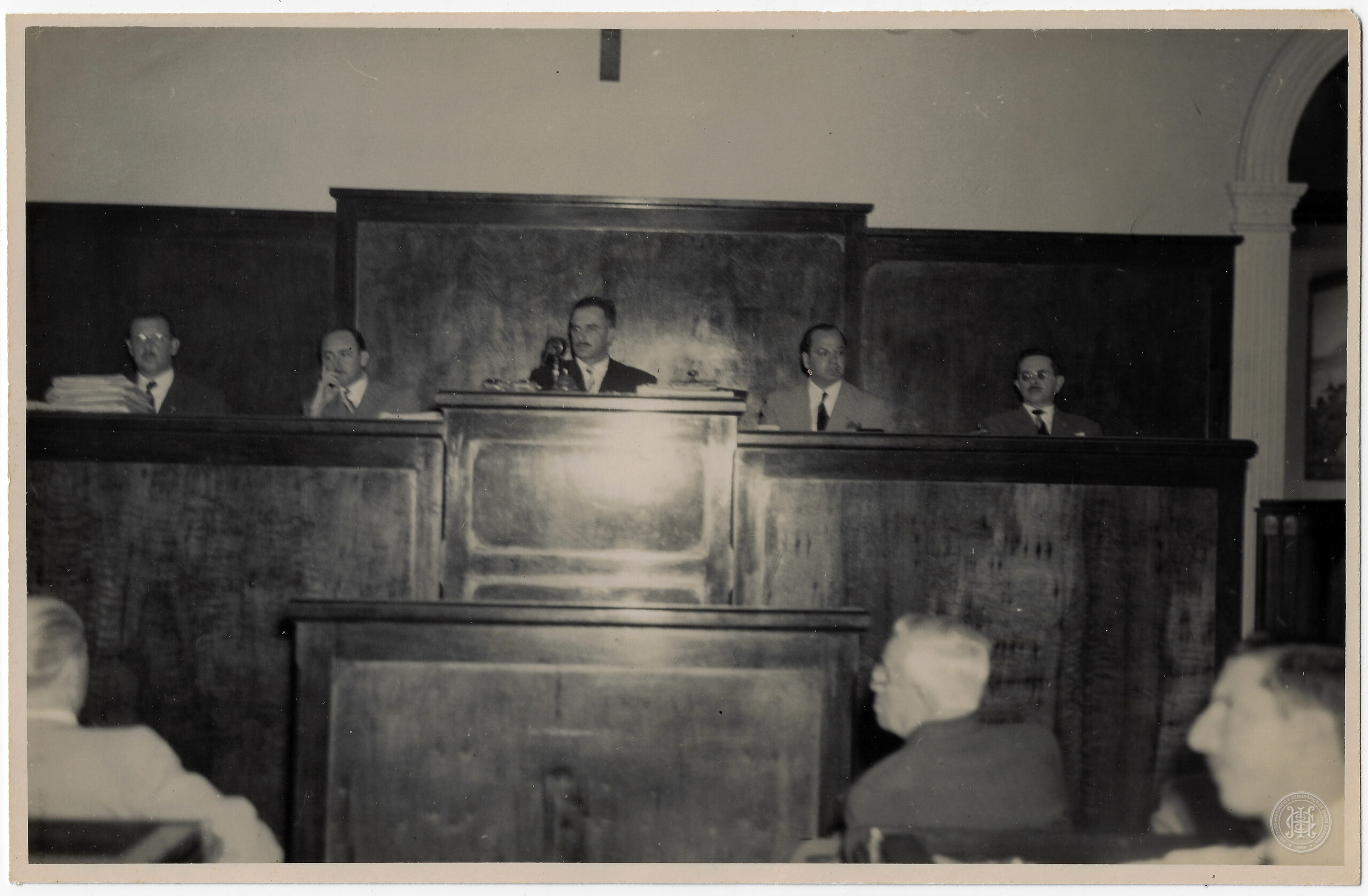 Registra uma sessão solene do Primeiro Congresso de História Catarinense, realizado em Florianópolis entre 5 e 12 de outubro de 1948. A composição organiza-se a partir de um plano médio centralizado em uma bancada elevada de madeira escura, onde cinco homens trajando paletós e gravatas estão dispostos lateralmente. O homem ao centro ocupa uma posição de destaque em um púlpito mais alto, com um microfone à sua frente, sugerindo a coordenação dos trabalhos ou um discurso em curso. Os demais integrantes da mesa estão distribuídos dois à esquerda e dois à direita, em posturas formais; o segundo homem da esquerda para a direita apoia o rosto na mão em gesto de escuta, enquanto pilhas de documentos são visíveis sobre a bancada na extremidade esquerda.