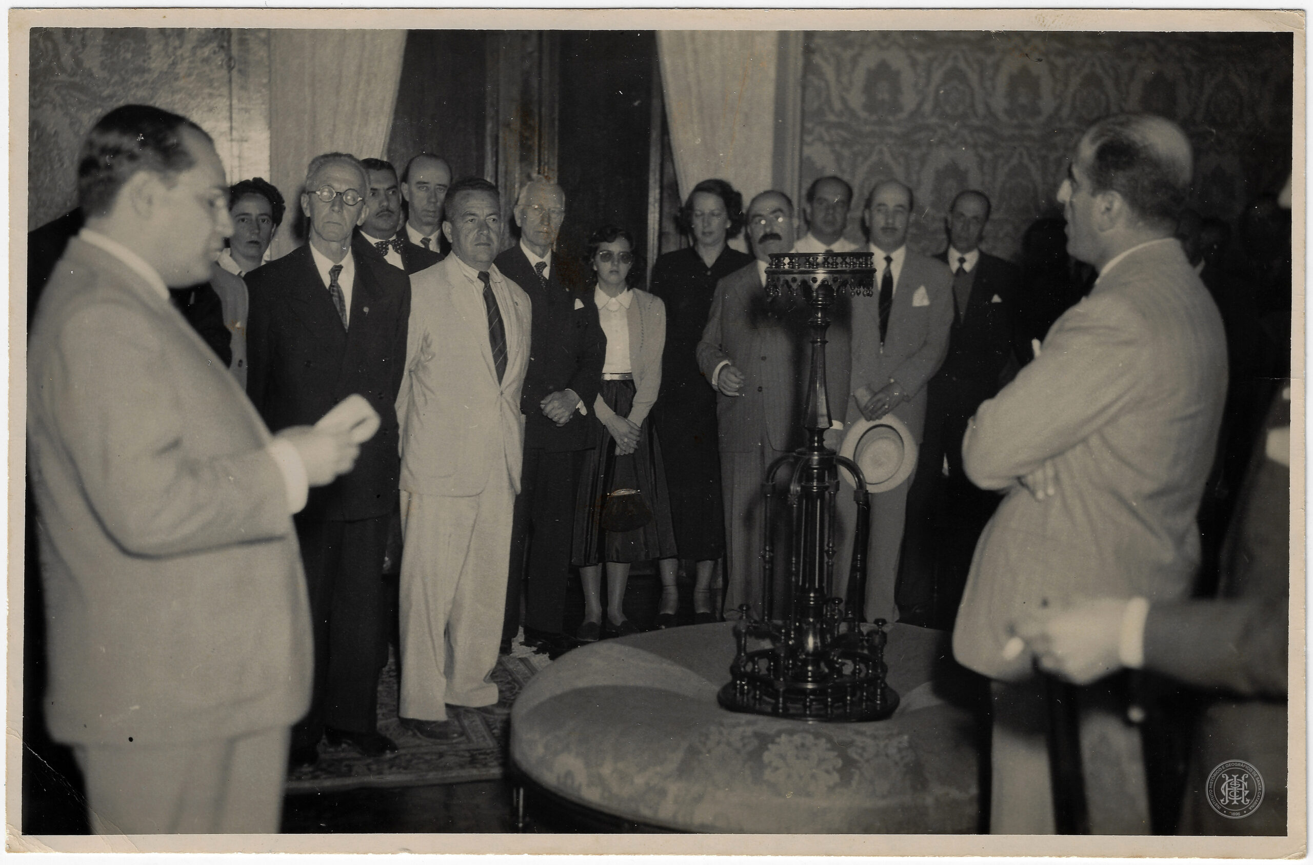Primeiro Congresso de História Catarinense, Florianópolis, Santa Catarina, Palácio do Governo, Visita Oficial, Governador de Santa Catarina, Professor Hélio Viana, Discurso, Solenidade, Recepção, Traje Formal, Década de 1940, História de Santa Catarina, Colonização Açoriana, Retrato Coletivo, Fotografia Documental, Interior de Edifício, Mobiliário, Papel de Parede, Evento Cultural.