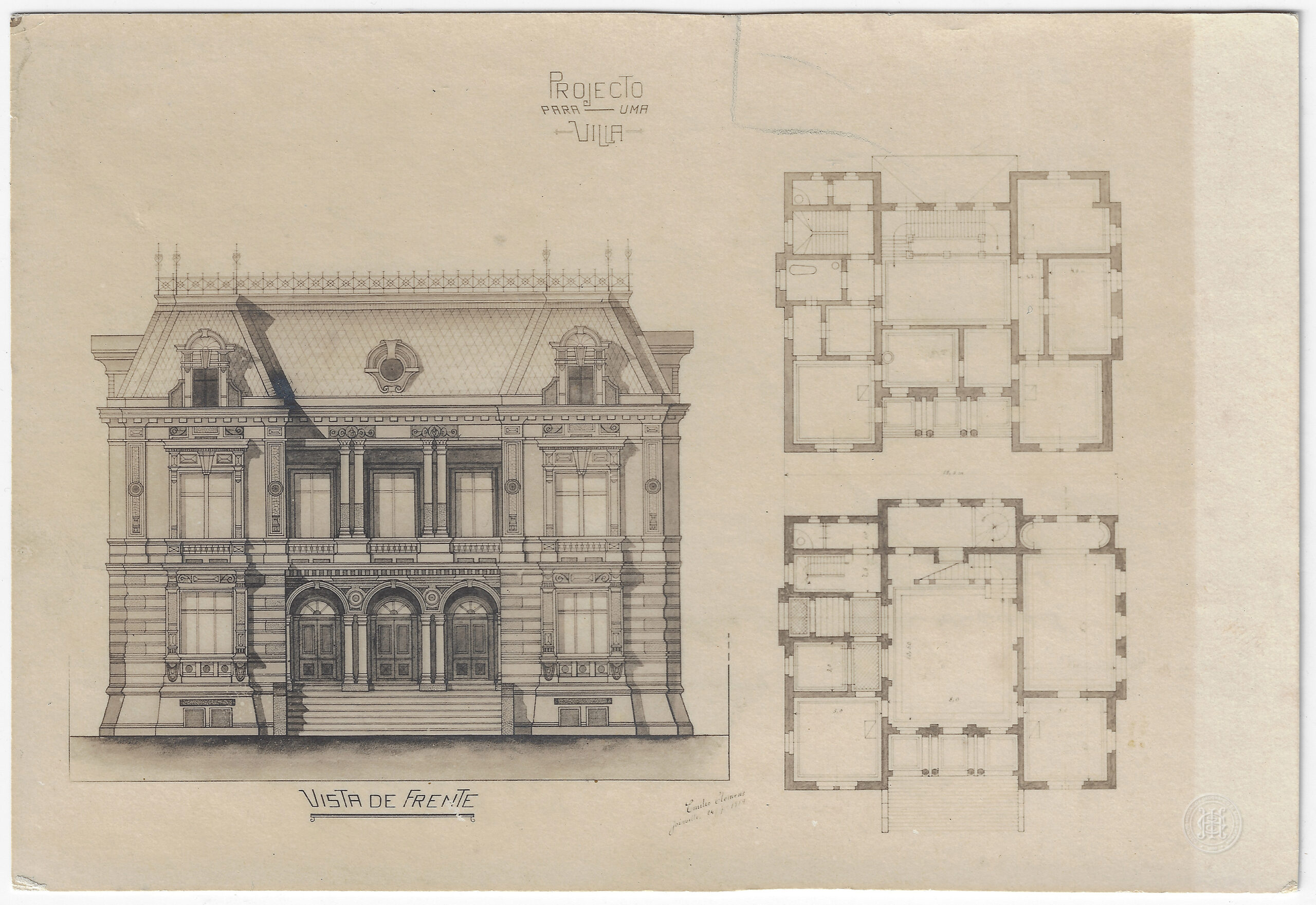 O detalhamento gráfico inclui hachuras que indicam texturas de cantaria no embasamento e sombreamento técnico que confere volumetria à fachada. As plantas baixas à direita apresentam a compartimentação dos espaços, indicando escadarias, vãos de portas e janelas, além de áreas de circulação. No canto inferior direito da imagem do anverso, identifica-se a assinatura manuscrita de Emilio Clemens, acompanhada da localidade e data. A iluminação representada é artificial, proveniente da técnica de desenho para destacar os relevos e ornamentos da platibanda, frisos e pilastras.