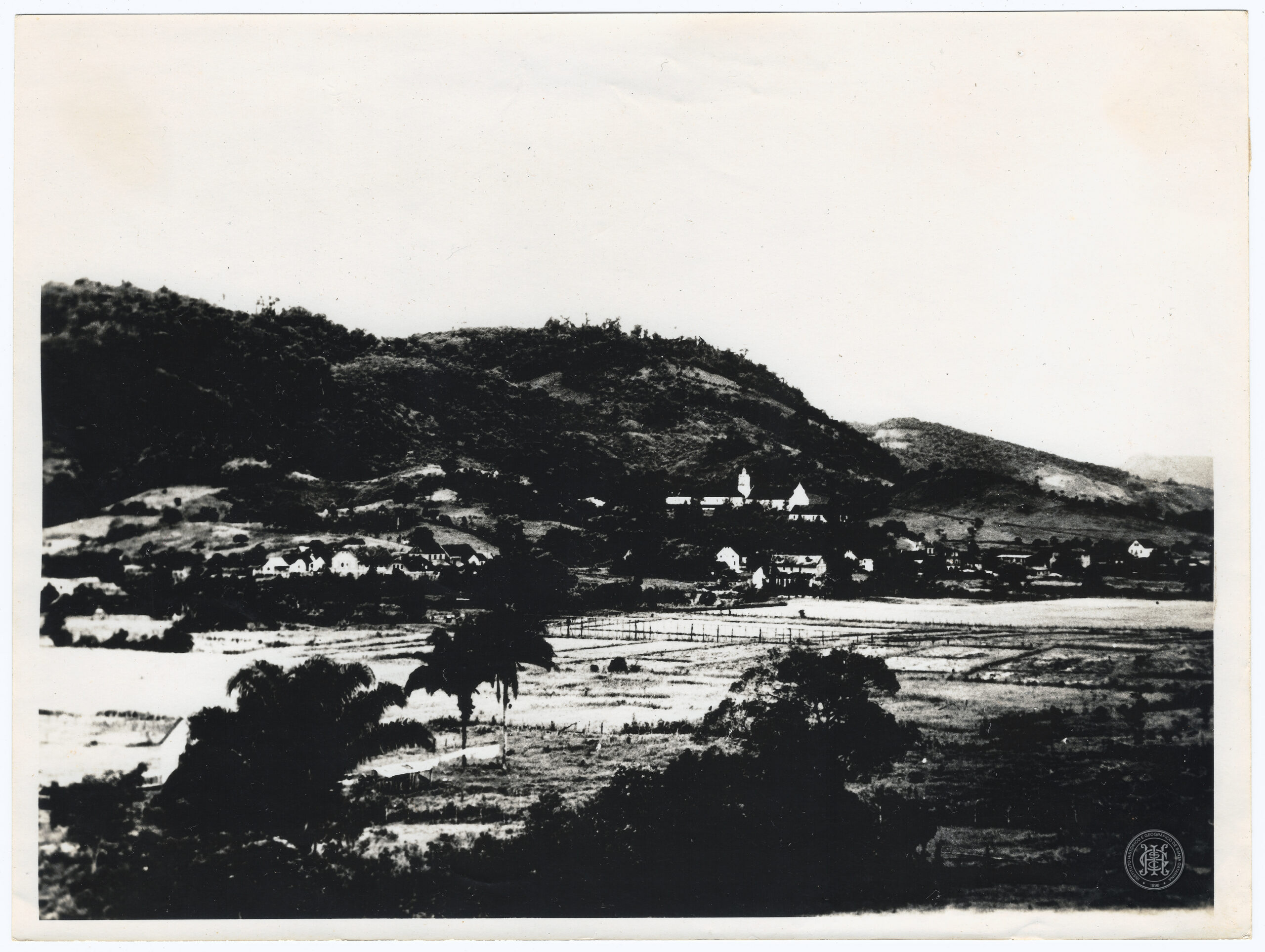 O plano de fundo é composto por elevações montanhosas recobertas por mata nativa que se encontram com um céu de tonalidade clara e uniforme. O enquadramento registra a organização de uma unidade produtiva familiar integrada à paisagem natural da região.
