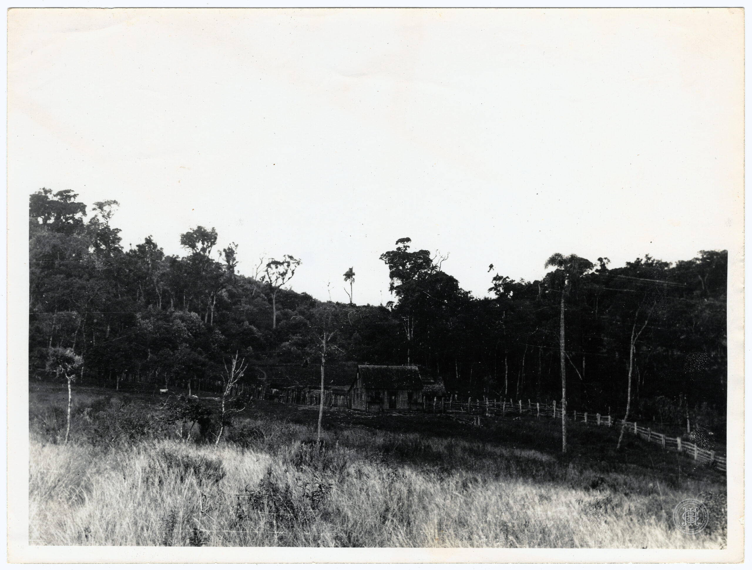 O plano de fundo é composto por elevações montanhosas recobertas por mata nativa que se estendem sob um céu de tonalidade clara e uniforme. O enquadramento registra a simplicidade e o isolamento característicos das habitações rurais do interior catarinense.