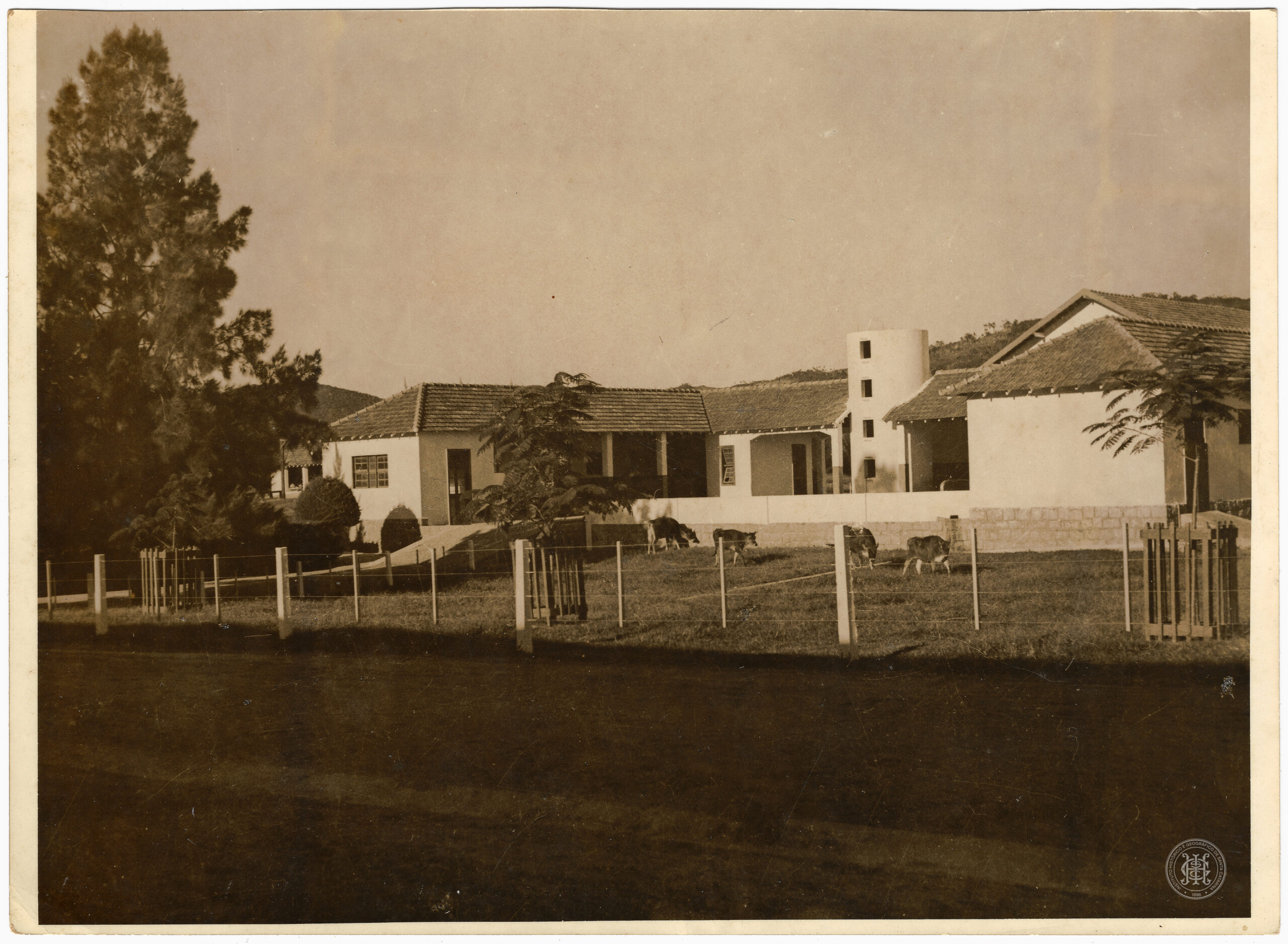 Propriedade rural composta por um conjunto arquitetônico de alvenaria e áreas destinadas à pecuária. Em primeiro plano, observa-se uma área de pastagem delimitada por uma cerca de arame e mourões de madeira clara, onde quatro animais bovinos pastam dispersos. Duas mudas de árvores, protegidas por cercados circulares de ripas de madeira, ladeiam a composição nas extremidades laterais.