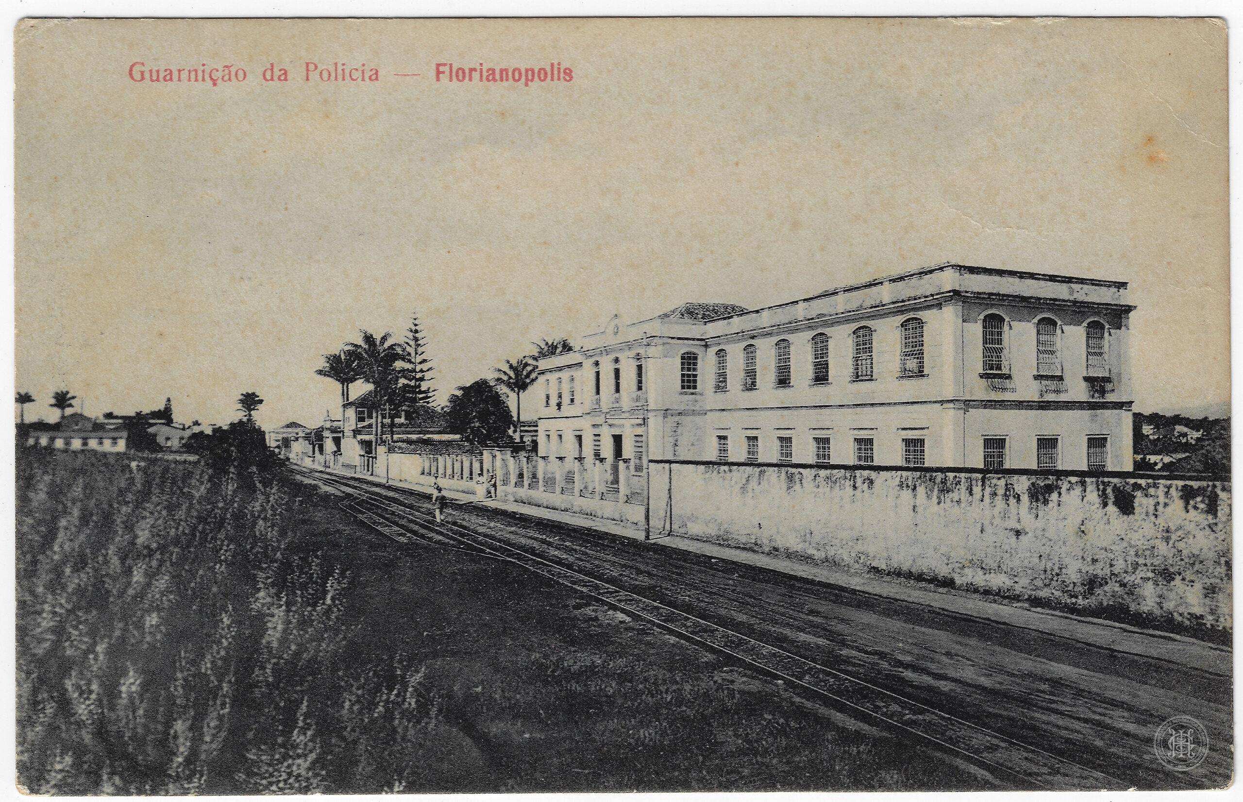 Vista em perspectiva da Guarnição da Polícia em Florianópolis. A composição é estruturada por uma estrada de terra com trilhos ferroviários aparentes que corta diagonalmente o primeiro plano, da base esquerda em direção ao centro da imagem. No plano médio, à direita, destaca-se uma imponente edificação de dois pavimentos em estilo eclético, caracterizada por uma sequência de janelas em arco pleno protegidas por grades metálicas e uma platibanda decorada. Um muro baixo com pilares define o limite da propriedade, separando a construção da via pública.