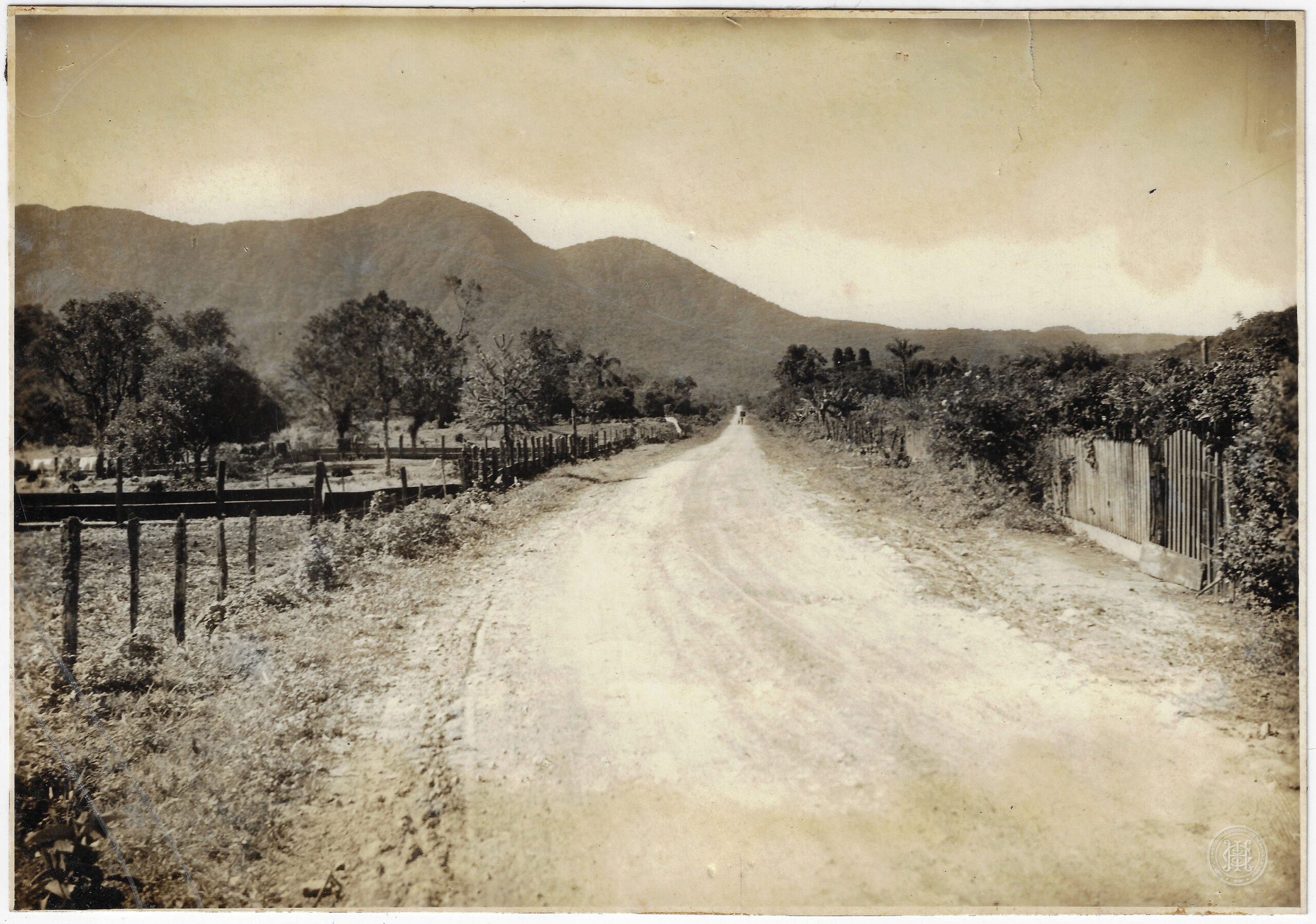 Paisagem Rural, Estrada, Estrada de terra, Estrada Dona Francisca, Joinville, Santa Catarina, Montanha, Relevo, Elevação, Serra, Vegetação, Mata Atlântica, Árvores, Cercas, Estacas, Portão, Propriedade Rural, Perspectiva, Setembro de 1939, Século XX, Infraestrutura viária, Patrimônio Histórico, Caminho rural, Elementos naturais, Paisagem e Elementos Naturais