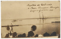 Realização do 1.º Páreo das Regattas do Centenário, em comemoração ao 1.º Centenário da Independência do Brasil, ocorrido em 6 de setembro de 1922, na cidade de Laguna, Santa Catarina. A composição é capturada a partir de uma perspectiva elevada, apresentando em primeiro plano, na base da imagem, a silhueta de uma multidão de espectadores, destacando-se chapéus e ombros de figuras masculinas.