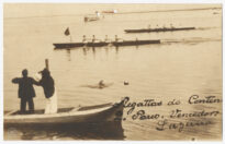Competição náutica denominada Regattas do Centenário, ocorrida em 1922, na cidade de Laguna, Santa Catarina. A composição organiza-se a partir de um plano frontal onde se observa, à esquerda, uma embarcação de pequeno porte com dois indivíduos de costas; um traja vestimenta escura e o outro utiliza peças claras, posicionando-se em pé.