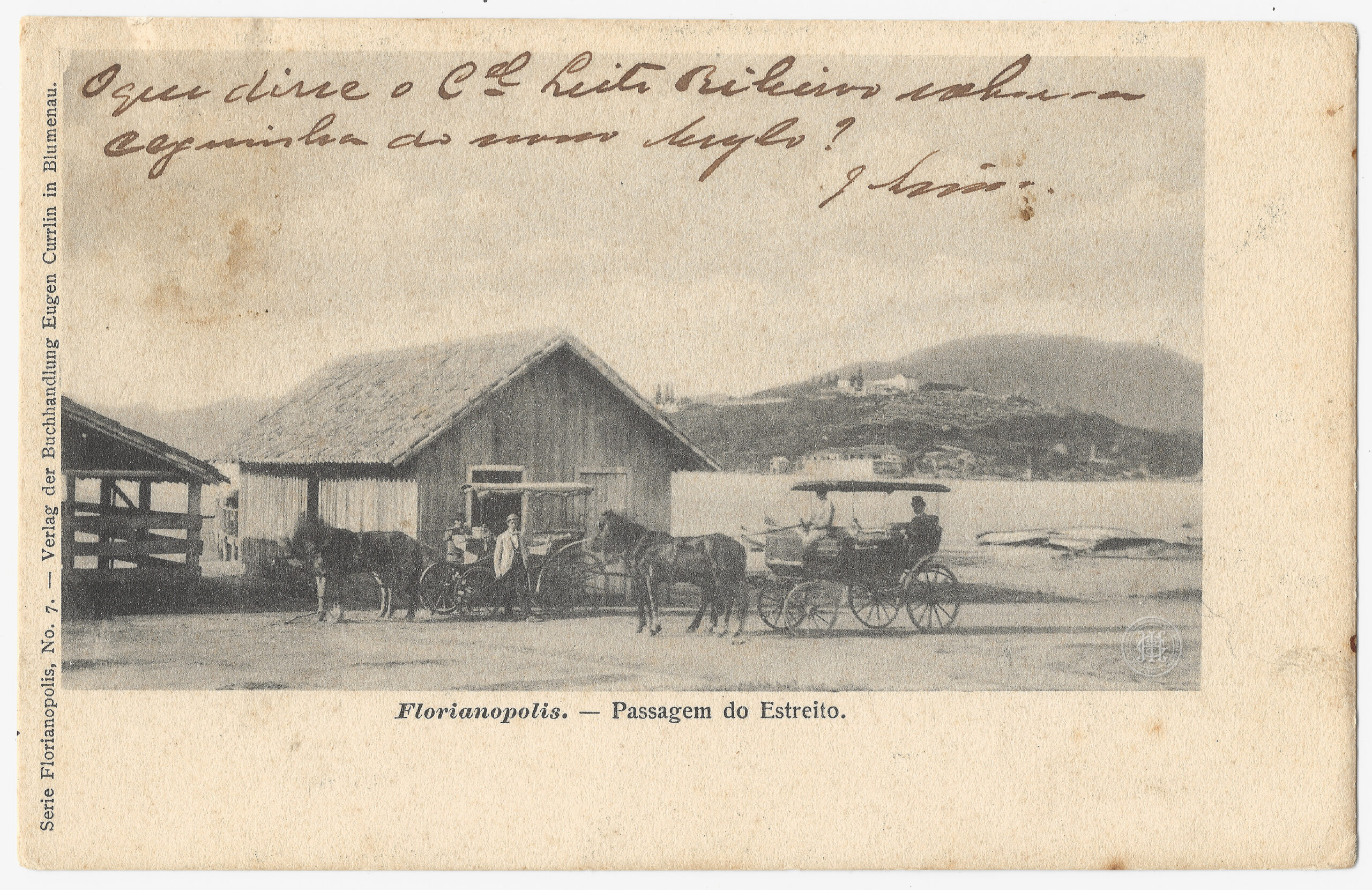 Frente: Serie Florianopolis, No. 7. — Verlag der Buchhandlung Eugen Currlin in Blumenau. O que disse o Coronel Leite Ribeiro sobre a [ilegível] do nosso [ilegível]?; [Assinatura ilegível]. Florianopolis. — Passagem do Estreito.