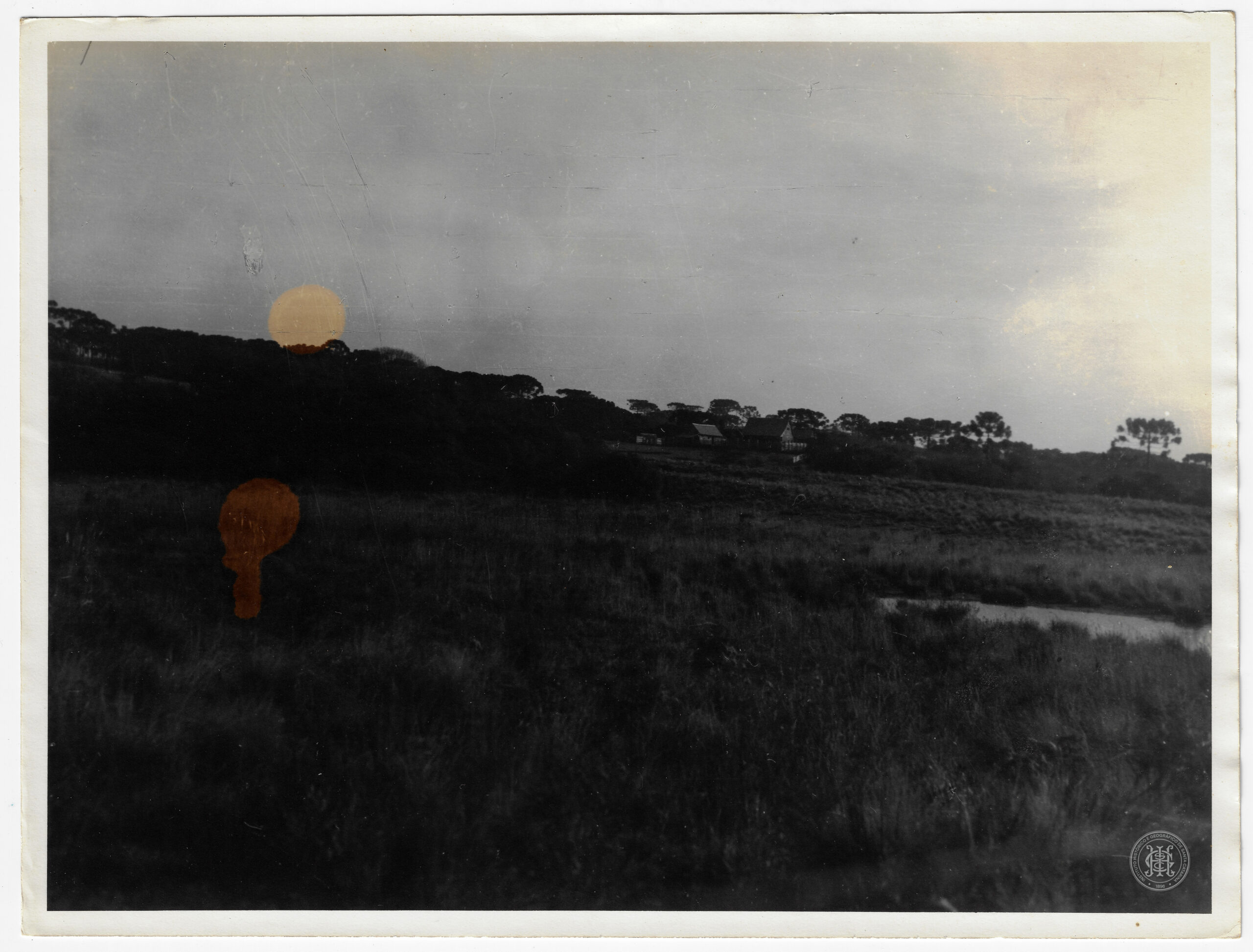 No plano médio, à esquerda, observa-se uma encosta suavemente elevada, densamente coberta por uma mata de galeria que inclui exemplares visíveis de araucárias, cujas copas em formato de cálice se destacam contra o céu. Próximo ao centro, no limite entre o campo e a mata, notam-se pequenas edificações rurais de madeira com telhados de duas águas.