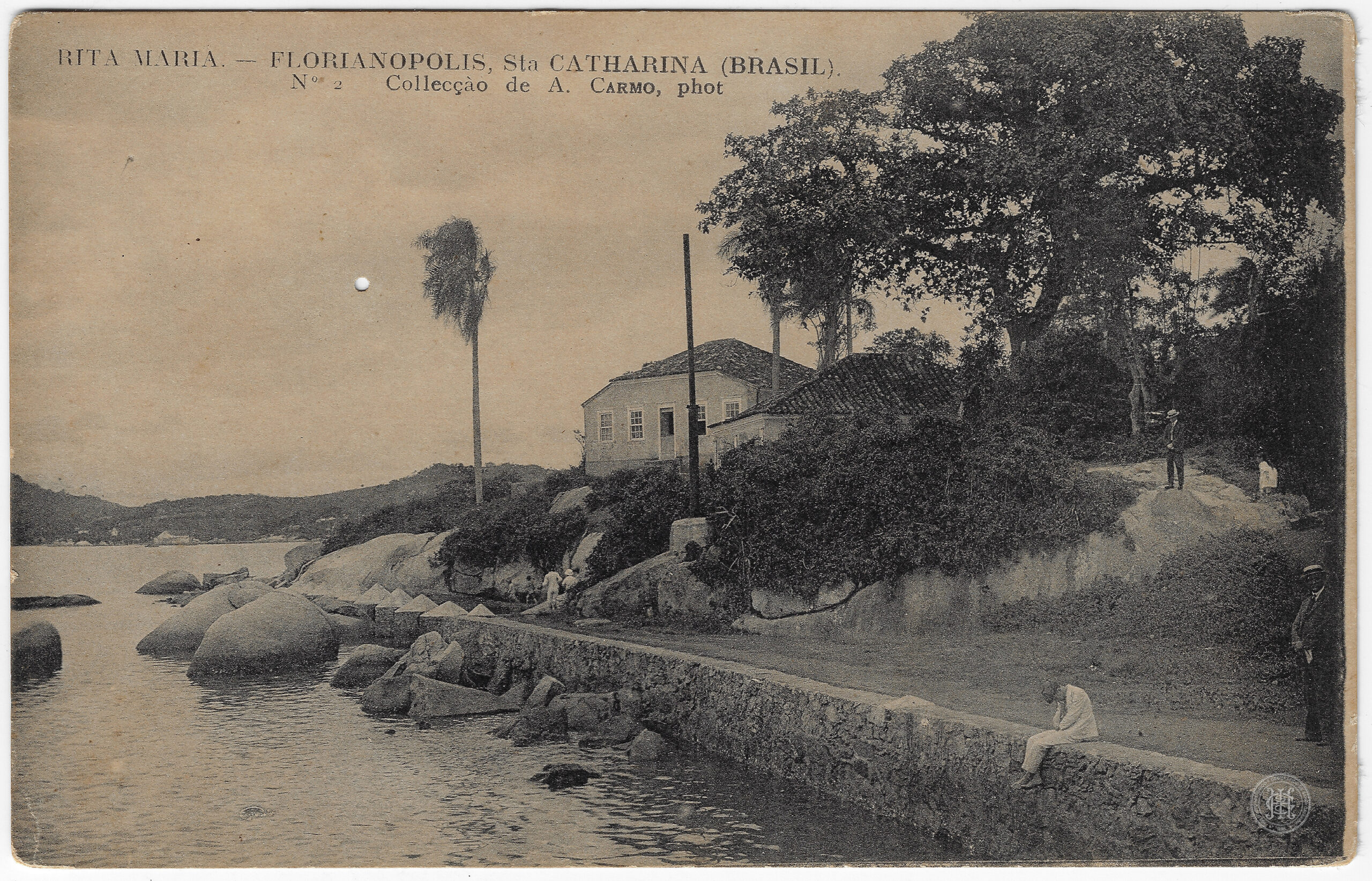 Datada de 1900, registra a localidade de Rita Maria, em Florianópolis, Santa Catarina. A composição é organizada em planos distintos: o primeiro plano apresenta um muro de contenção em alvenaria de pedra que percorre a margem da Baía Norte, onde um indivíduo trajado com vestimentas claras e chapéu está sentado. À direita, um homem em pé, vestindo terno escuro e chapéu, observa a cena. O plano médio revela a interface entre o ambiente marítimo e o terrestre, com grandes formações rochosas (matacões) imersas na água à esquerda e uma elevação de terreno à direita, onde se localiza uma edificação de arquitetura luso-brasileira, de pavimento térreo, telhado de quatro águas e janelas de guilhotina.