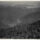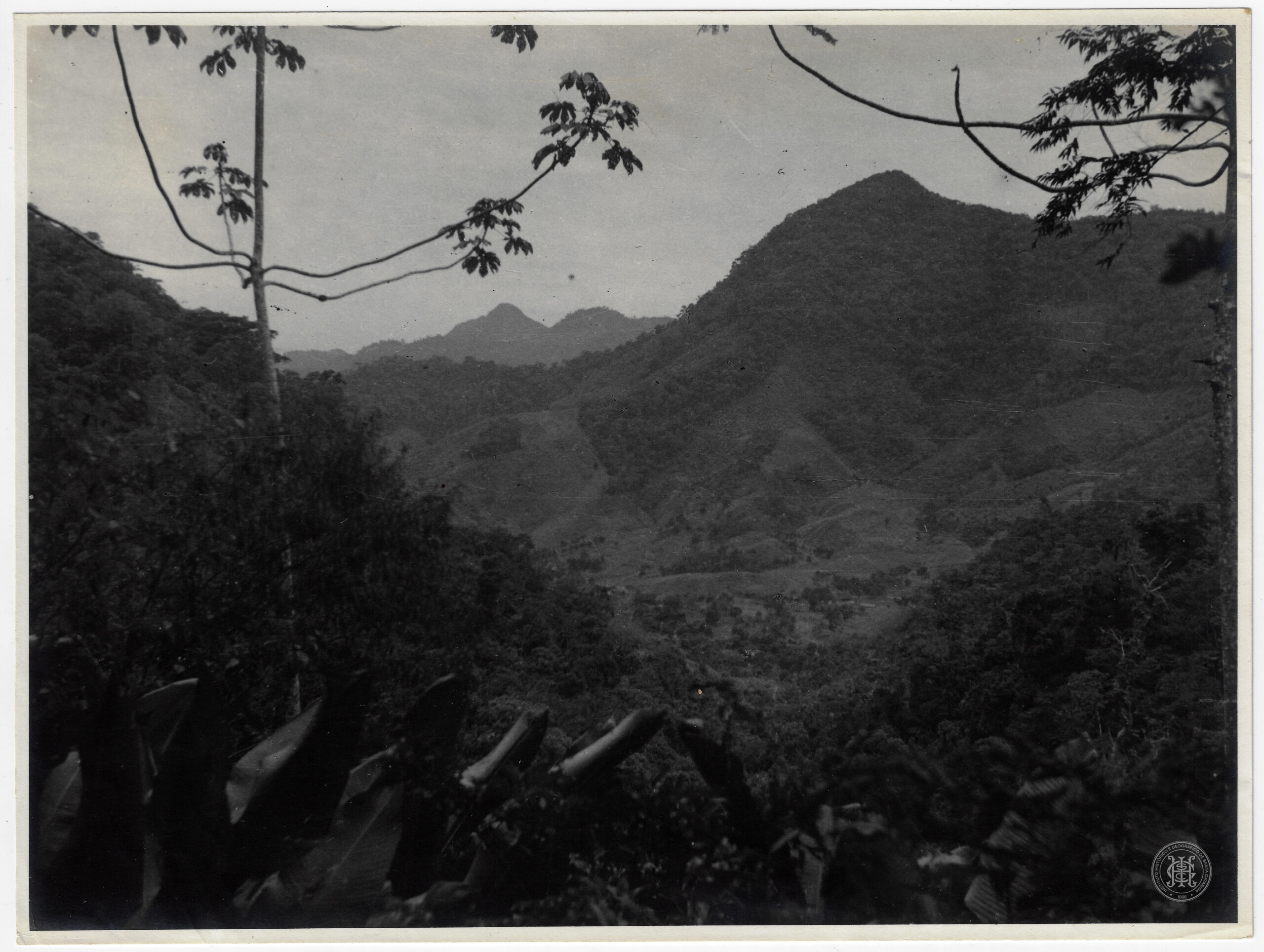 No plano médio, observa-se um vale profundo circundado por encostas íngremes, onde manchas de vegetação rasteira ou áreas de cultivo se intercalam à floresta densa. O plano de fundo é dominado por uma sucessão de cumes montanhosos, destacando-se uma elevação de formato piramidal à direita, cujas vertentes apresentam variações de tonalidade que sugerem a topografia do terreno. O céu apresenta-se límpido e ocupa a porção superior da imagem, estabelecendo um contraste tonal com a massa escura das montanhas.
