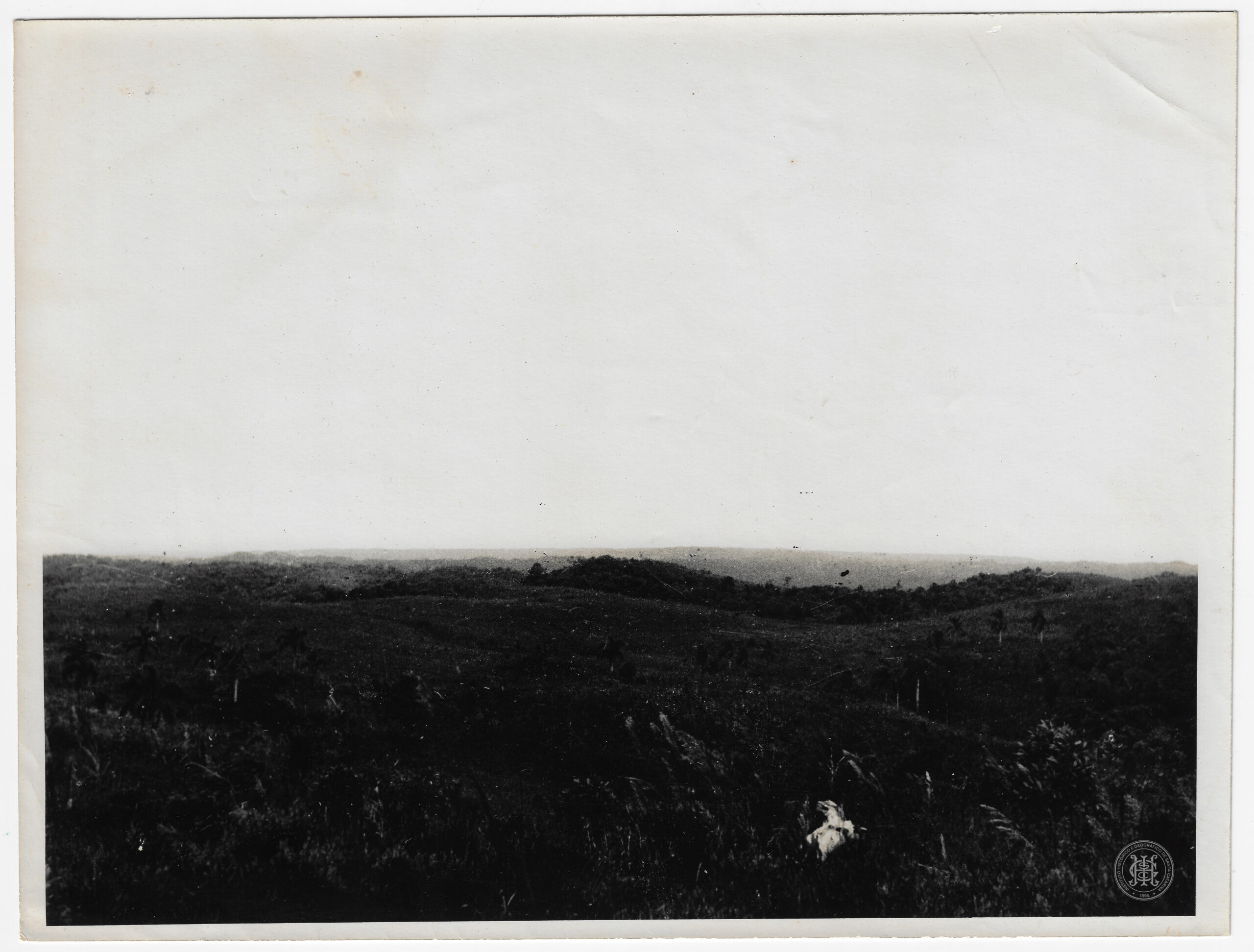 O plano médio é dominado por uma sucessão de colinas suaves, cujas encostas são cobertas por vegetação densa e contínua, apresentando variações sutis de contraste que definem a ondulação do terreno. Algumas palmeiras isoladas emergem da massa vegetal em pontos dispersos.