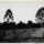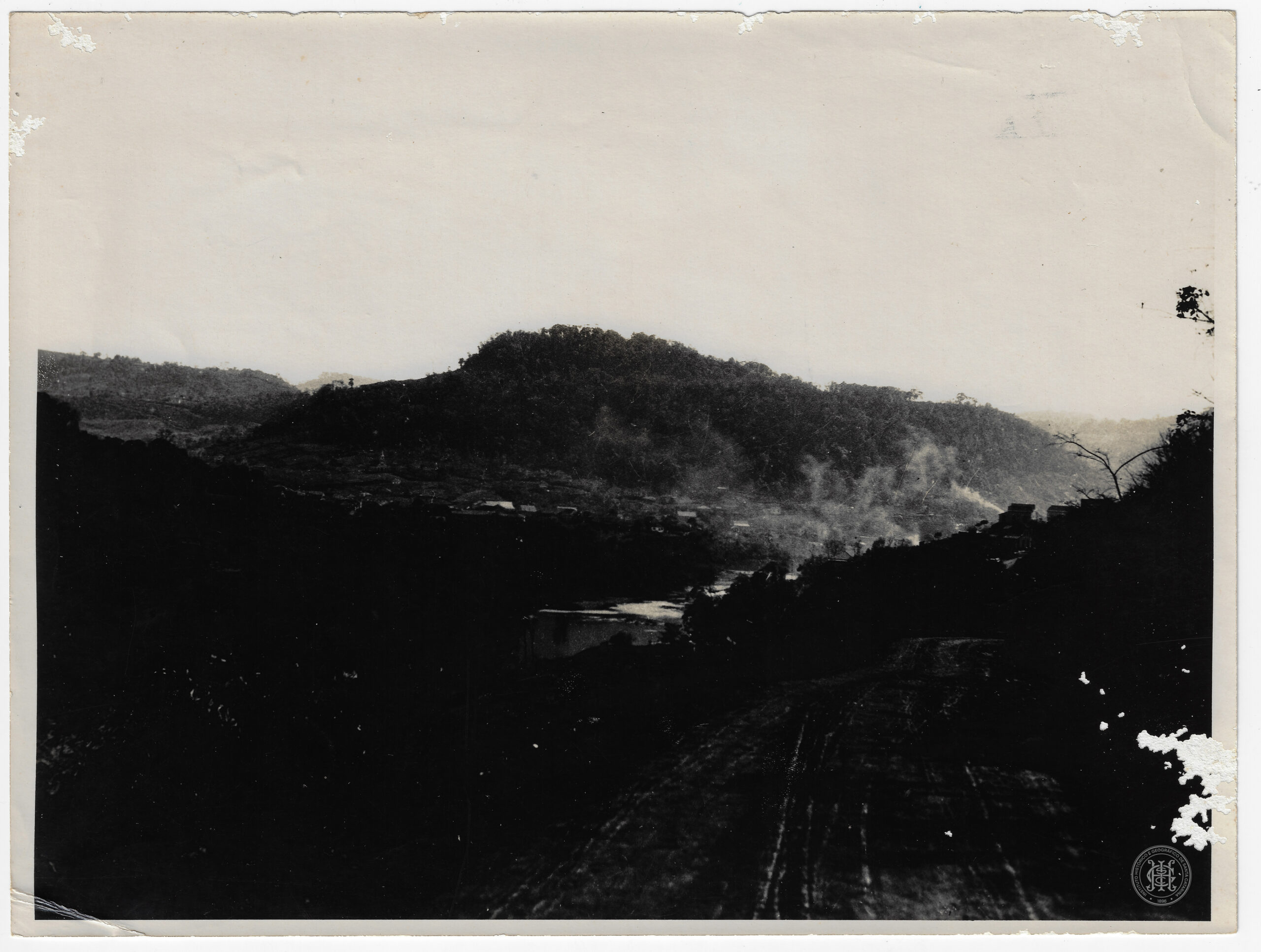 No plano médio, observa-se o curso de um rio que serpenteia pelo vale, ladeado por pequenas construções civis e moradias dispersas. Ao centro, destaca-se uma elevação de encostas íngremes e topo arredondado, densamente coberta por vegetação de floresta, em cujas bases se nota a presença de fumaça ou neblina dispersa, sugerindo atividade humana ou fenômeno climático. O plano de fundo apresenta sucessivas camadas de morros sob um céu claro que ocupa a porção superior da composição.