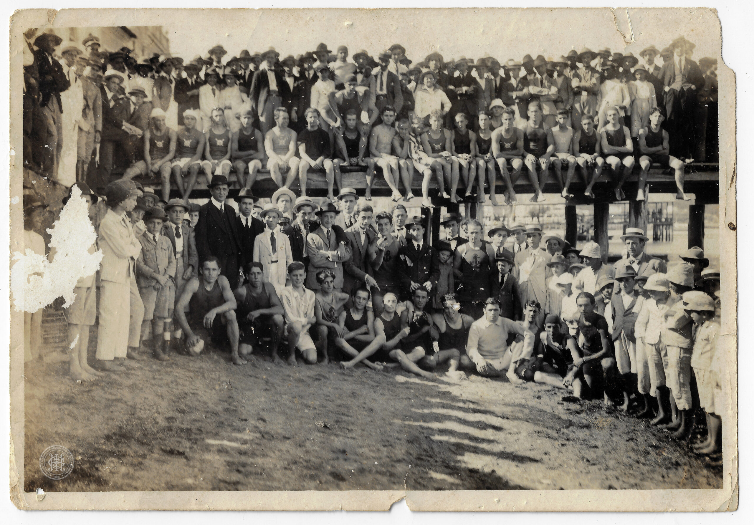 Grupo de remadores e sócios dos clubes Riachuelo e Martinelli reunidos na Baía Sul, em Florianópolis, no dia 21 de abril de 1921. A cena celebra o desfecho do 6° páreo da Taça Lauro Carneiro, vencido pelo Clube de Regatas Martinelli, seguido pelos clubes Riachuelo e Barroso. A composição é marcada por uma densa aglomeração de figuras masculinas distribuídas em diferentes níveis: um numeroso grupo está posicionado sobre um trapiche de madeira que atravessa o plano médio, enquanto outros sujeitos ocupam a faixa de areia em primeiro plano. Ao fundo, observa-se a estrutura do trapiche que se estende sobre a água da baía, onde se vislumbram pequenas embarcações e construções distantes na linha do horizonte.
