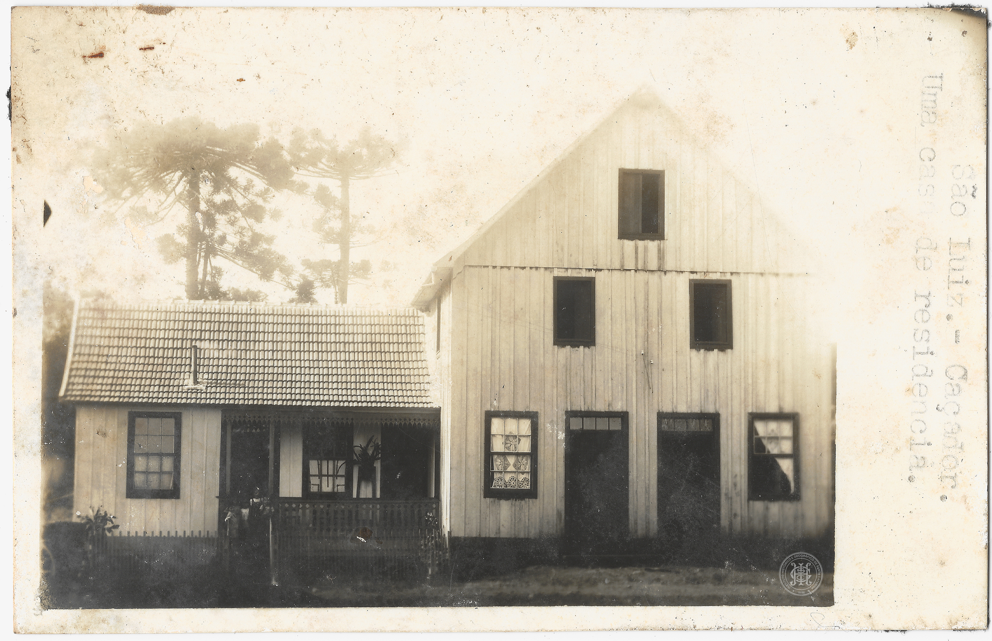 Casa de residência, Residência, Habitação, Arquitetura de Madeira, São Luiz, Caçador, Santa Catarina, Telhado de duas águas, Telhas cerâmicas, Lambrequins, Tábuas verticais, Alpendre, Escadaria de madeira, Chaminé metálica, Moendas de pedra, Cerca de ripas, Espaços Rurais, Patrimônio Privado e Residencial, Vida Cotidiana