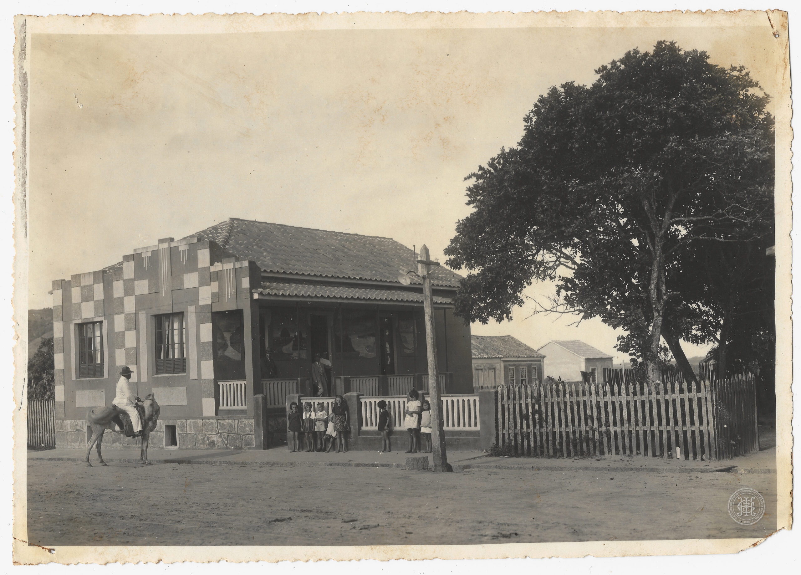 Residência, Arquitetura Residencial, Luiz Schmitz, Arquitetura Art Déco, Jaguaruna, Santa Catarina, Casa, Moradia, Varanda, Platibanda, Crianças, Grupo Infantil, Cavaleiro, Cavalo, Montaria, Via Pública, Terra Batida, Cerca de Madeira, Poste de Energia, Árvore, Paisagem Urbana, Patrimônio Privado, Década de 1930