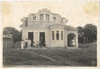 Esta fotografia horizontal em tons de sépia registra a fachada frontal da residência do Sr. Serafim Antônio, localizada na vila de Sangão, no município de Jaguaruna, Santa Catarina. A edificação, de arquitetura eclética com influências do estilo missões, apresenta um corpo central com platibanda ornamentada por volutas e um frontão escalonado que abriga um conjunto de quatro janelas superiores.