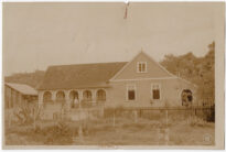 À esquerda da casa principal, nota-se uma construção secundária em madeira com telhado de duas águas. O imóvel é cercado por uma paliçada de madeira (ripas verticais) que delimita o jardim frontal da área externa.