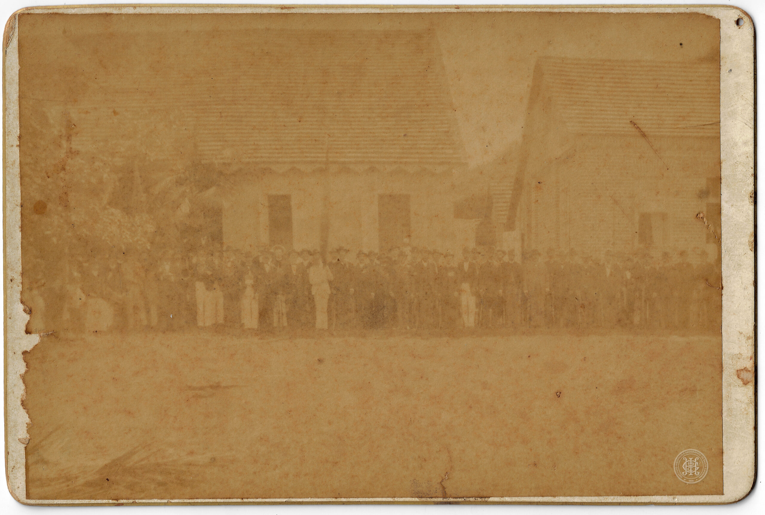 Retrato coletivo de um numeroso grupo de sujeitos masculinos posicionados à frente de duas edificações, identificados no verso pela inscrição "Banda". Os integrantes estão dispostos em uma linha horizontal contínua que atravessa toda a extensão do plano médio da imagem.