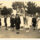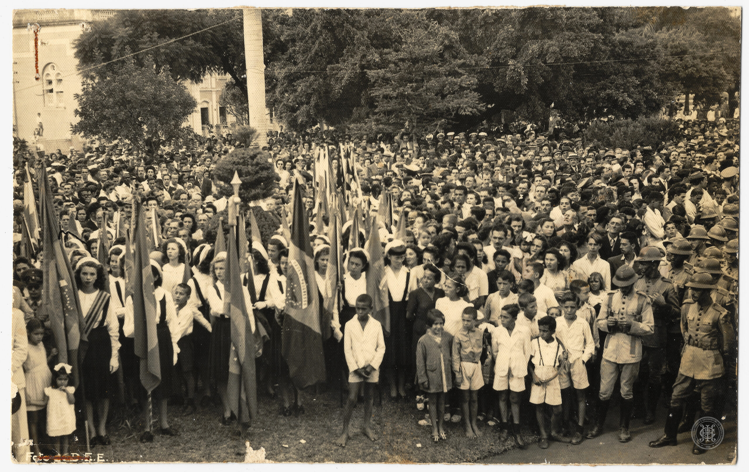 O plano médio é preenchido por uma massa compacta de civis — homens, mulheres e crianças — com vestimentas típicas da década de 1940, como chapéus e paletós. A composição revela a escala do evento público, com a multidão estendendo-se até o plano de fundo, onde a vegetação arbórea da praça delimita o espaço. No canto superior esquerdo, é visível parte da arquitetura de um edifício com janelas em arco. A iluminação natural produz sombras marcadas, destacando as texturas das fardas e a profundidade da aglomeração humana.