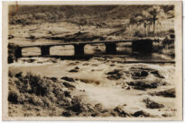 No plano médio, uma ponte de estrutura retilínea, composta por um tabuleiro escuro sustentado por quatro pilares maciços de alvenaria ou pedra, atravessa o rio horizontalmente de uma margem à outra. Logo atrás da ponte, na margem direita, há uma cerca de madeira e uma edificação rural parcialmente visível entre a vegetação, além de palmeiras altas e folhagens densas.