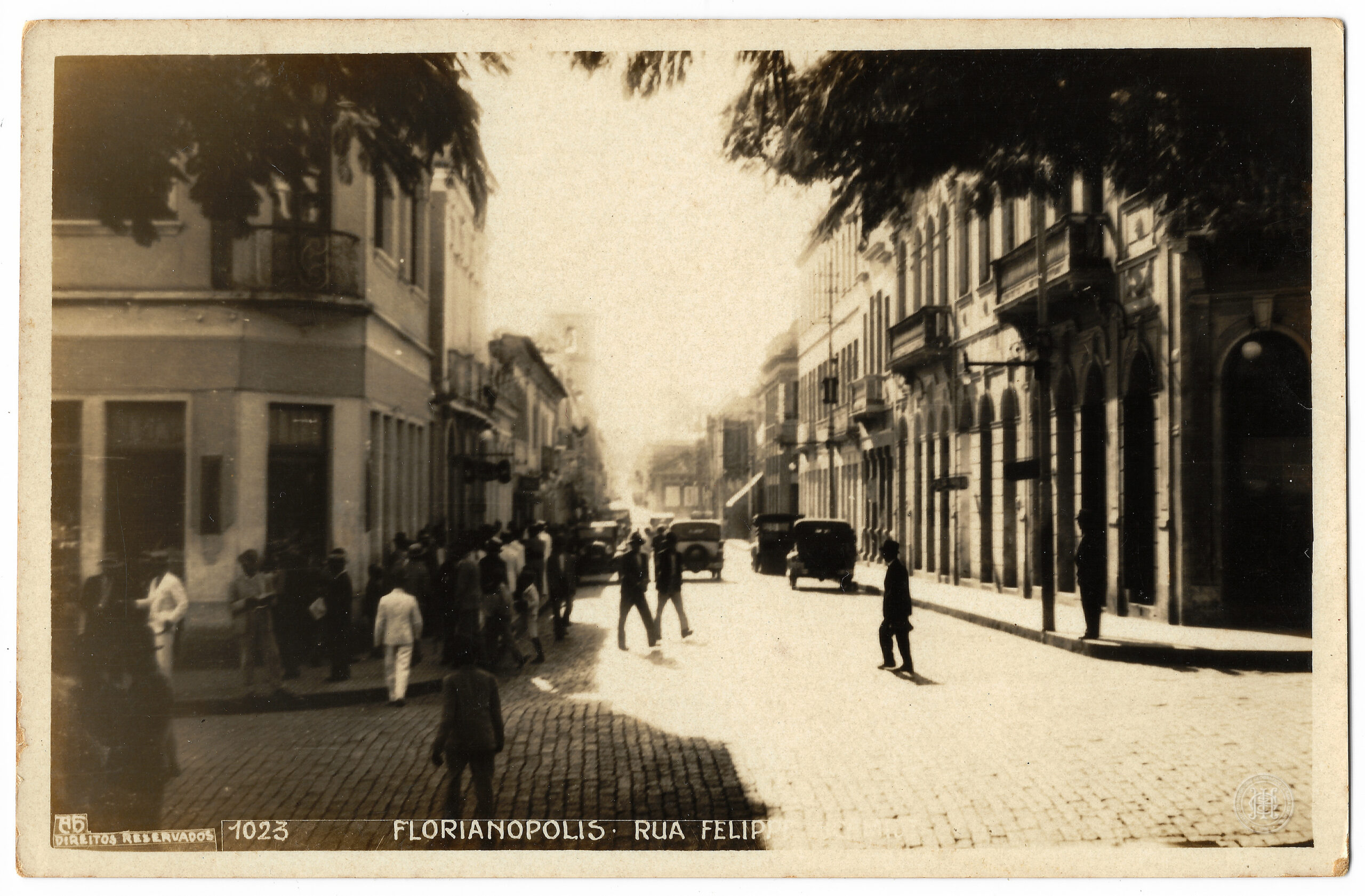 Vista em perspectiva da Rua Felipe Schmidt em Florianópolis, Santa Catarina, no ano de 1930. A composição organiza-se a partir de um ponto de fuga central que percorre o leito da via pavimentada com paralelepípedos, ladeada por edifícios de arquitetura eclética com dois a três pavimentos, caracterizados por vãos em arco pleno, sacadas com gradis de ferro e ornamentos em relevo nas fachadas. No primeiro plano, à esquerda, observa-se um grupo denso de transeuntes masculinos trajando indumentária formal da época, composta por ternos de tons claros e escuros e chapéus (modelo Fedora ou Panamá); um homem caminha isolado no centro da via em direção ao plano médio, enquanto outros sujeitos estão posicionados próximos às calçadas.