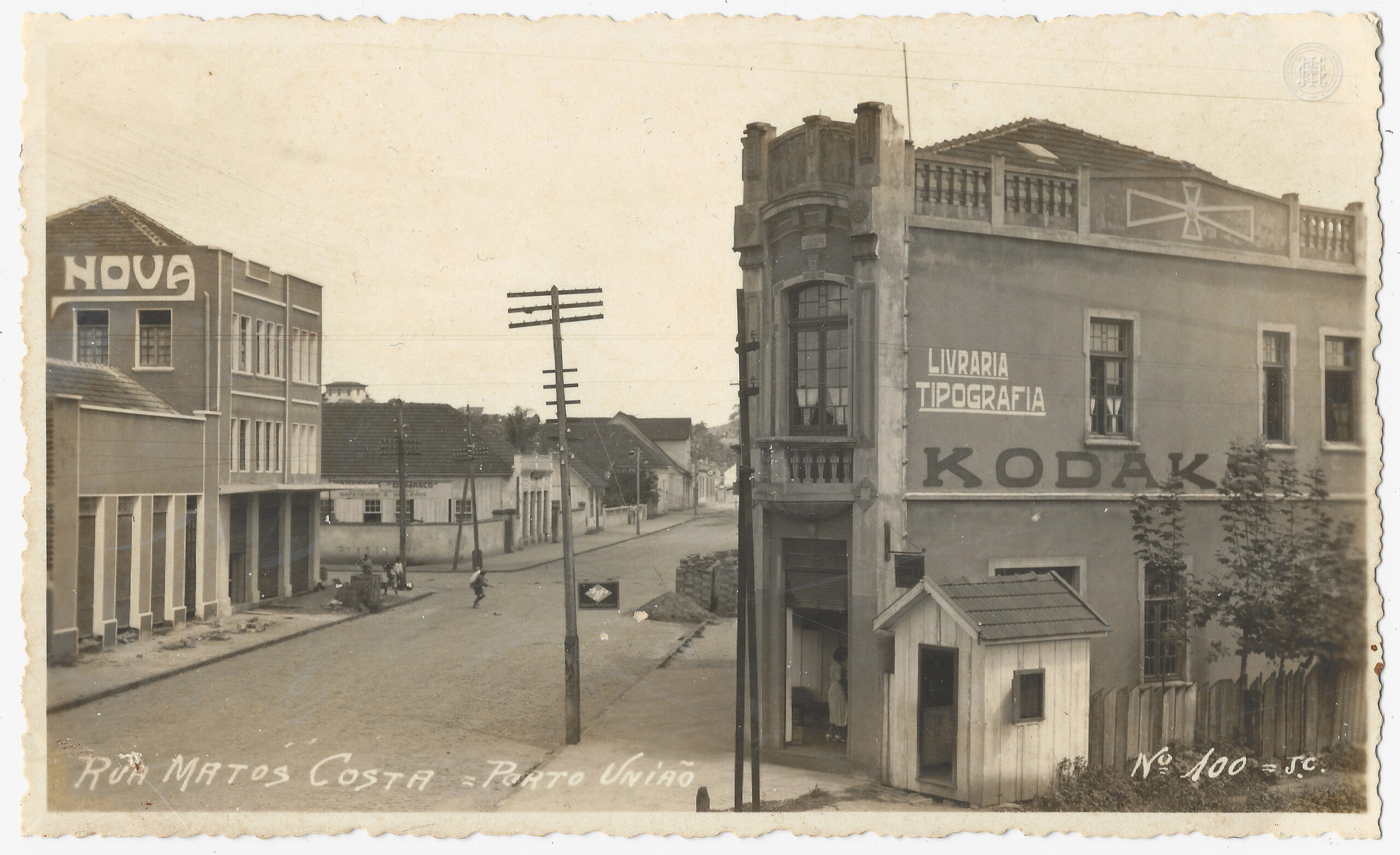 Paisagem Urbana, Logradouros e Lugares Urbanos, Rua Matos Costa, Porto União, Santa Catarina, Arquitetura, Edificações, Livraria e Tipografia, Kodak, Comércio, Urbanização, Pavimentação, Poste de Energia, Iluminação Pública, Fiação Elétrica, Cotidiano, Década de 1930, J. Cleto, Cartão-Postal