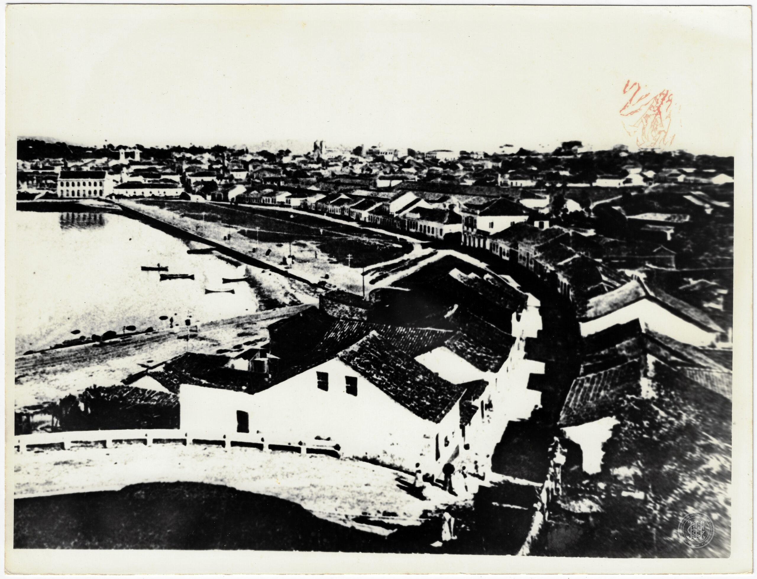 No primeiro plano, observa-se o topo de edificações térreas e sobrados com telhados de telha cerâmica, além de uma via em curva delimitada por uma mureta clara, onde se notam pequenas figuras humanas (transeuntes). O plano médio é caracterizado pela densidade do casario colonial alinhado ao longo de ruas que convergem para a orla. À esquerda, destaca-se uma faixa de praia e as águas da Baía Sul, onde se visualizam algumas pequenas embarcações (botes ou canoas) atracadas ou próximas à margem. Uma via reta, possivelmente um aterro incipiente ou avenida litorânea, corta a paisagem em direção ao fundo.