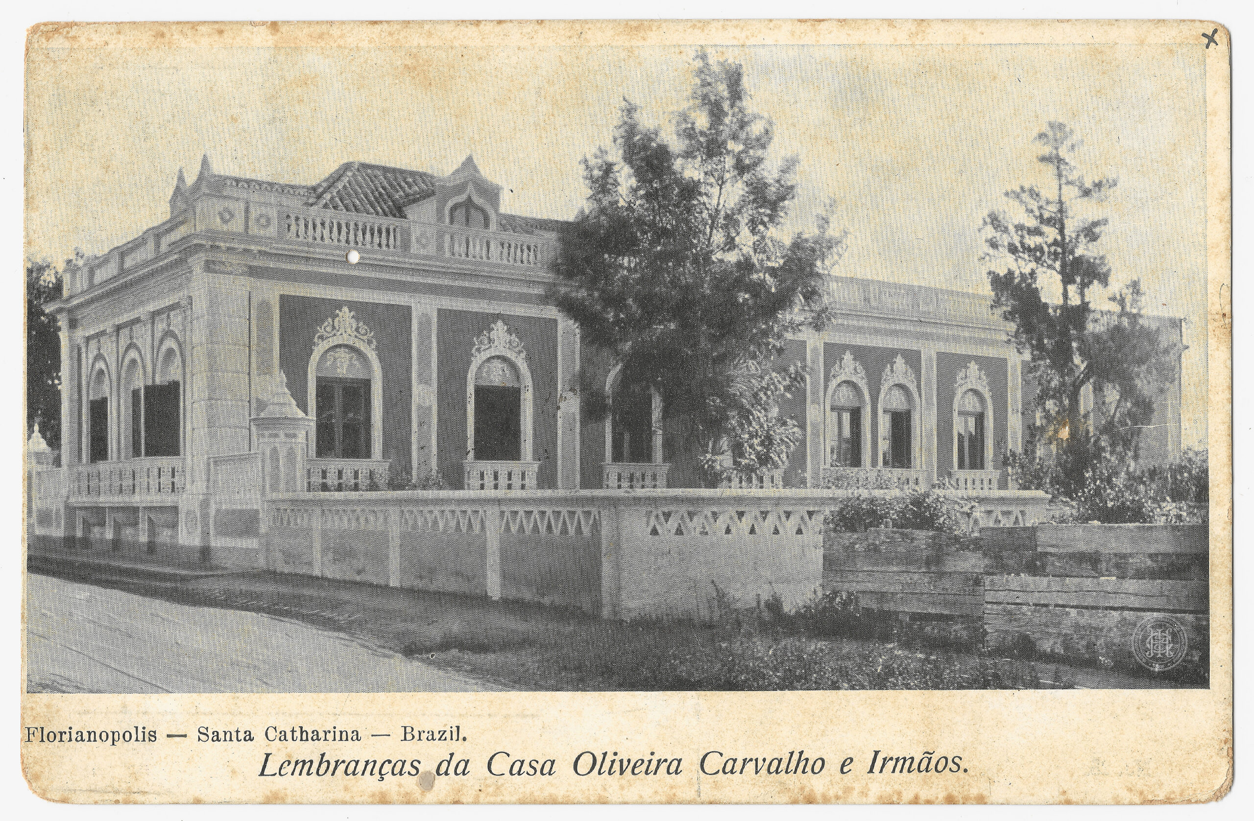 Vista externa em perspectiva oblíqua da antiga residência da Casa Oliveira Carvalho e Irmãos, localizada na Rua Rui Barbosa, no bairro Agronômica, em Florianópolis, Santa Catarina. Em primeiro plano, observa-se parte de um logradouro público e um muro baixo de alvenaria com elementos vazados e decorativos que circunda a propriedade. No plano médio, destaca-se a edificação de arquitetura eclética, composta por um volume principal de dois pavimentos (sobrado) à esquerda e uma ala lateral de pavimento único à direita. A fachada exibe janelas em arco pleno com molduras ornamentadas, balustradas no coroamento do telhado e detalhes em relevo nas platibandas. Uma árvore de médio porte posicionada entre os dois volumes da casa encobre parcialmente a fachada, enquanto o plano de fundo é composto por vegetação densa e céu claro. A margem inferior do anverso contém a inscrição impressa "Florianopolis — Santa Catharina — Brazil. Lembranças da Casa Oliveira Carvalho e Irmãos.", integrando a identificação do local e do proprietário ao suporte.