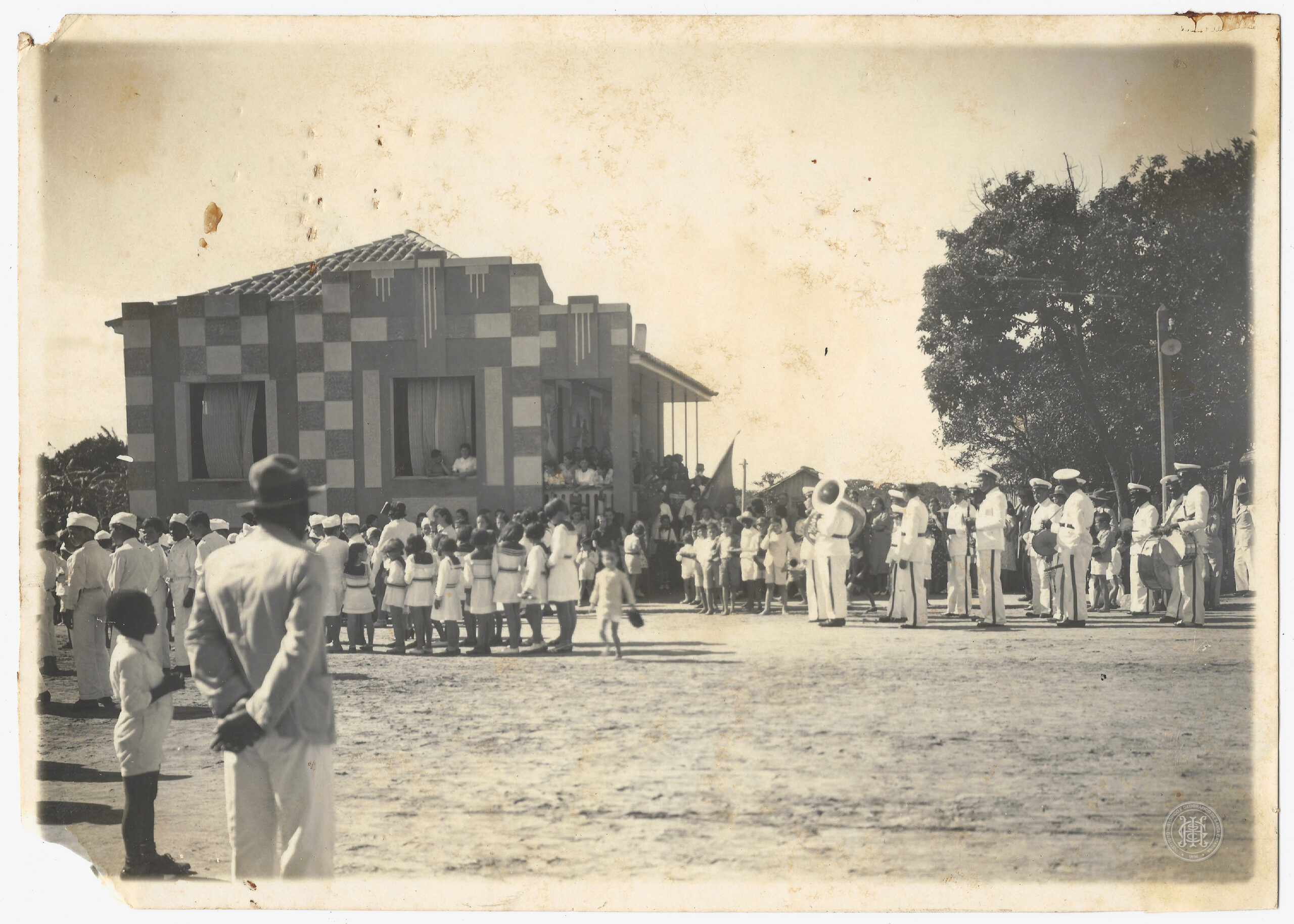 Ao centro, um grupo de crianças uniformizadas com trajes claros e quepes alinha-se diante de uma edificação de arquitetura art déco, que apresenta fachada com padrões geométricos em dois tons e platibanda escalonada com frisos verticais. No plano médio, à direita, posiciona-se uma banda de música militar ou civil, cujos integrantes vestem uniformes brancos e executam instrumentos de sopro e percussão, incluindo um sousafone e tambores.