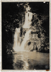 A composição organiza-se em três planos de queda principal: no plano de fundo superior, a água verte de uma crista rochosa estreita, descendo em um fluxo vertical contínuo; no plano médio, a água atinge um patamar intermediário e se divide em duas vertentes principais que correm sobre formações rochosas escuras e irregulares; no primeiro plano, os fluxos convergem para uma bacia de recepção de águas calmas, que ocupa o terço inferior da imagem e apresenta reflexos da luz e da vegetação circundante.