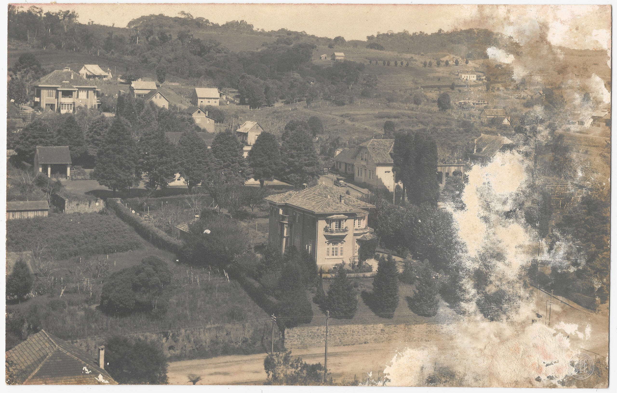 Ao fundo, o terreno eleva-se em encostas suaves onde se distribuem diversas outras residências de diferentes estilos e dimensões, intercaladas por áreas de pastagem, arvoredo e plantações dispostas em fileiras regulares. A direita da imagem apresenta danos físicos severos na emulsão fotográfica, com grandes manchas esbranquiçadas, perda de detalhe e sujidades que ocultam parte da paisagem e do casario. O horizonte é marcado por morros cobertos por vegetação sob um céu claro.