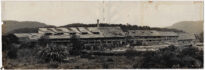 No extremo esquerdo, nota-se uma construção menor com telhado cerâmico. O terreno é plano e descampado na área fabril. Ao fundo, a paisagem é delimitada por uma elevação geográfica (morro) densamente coberta por vegetação nativa, sob um céu de tonalidade clara e uniforme.