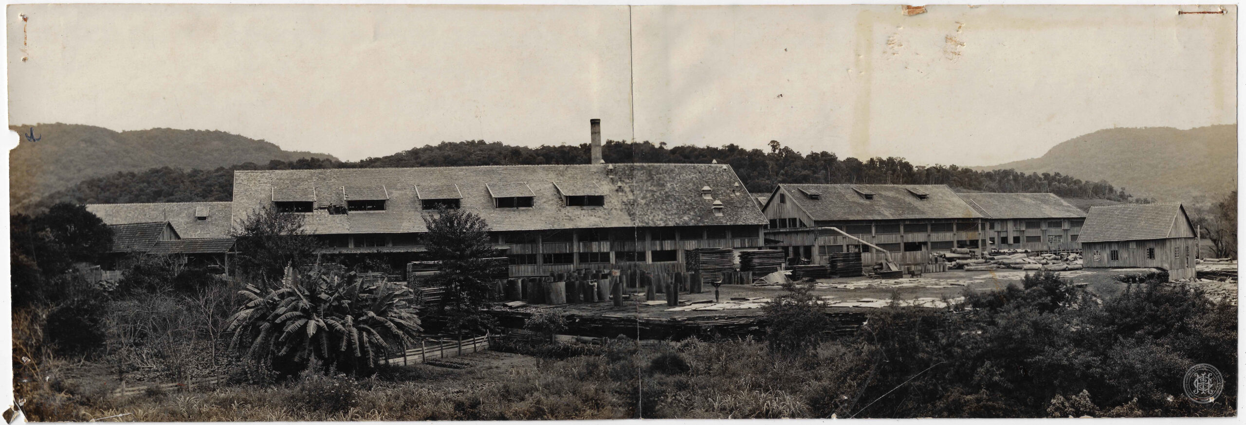 Paisagem Industrial, Sociedade Madereira S.A., Rio do Sul, Santa Catarina, Indústria Madeireira, Galpão de Madeira, Arquitetura Industrial, Chaminé, Estoque de Madeira, Tábuas, Vale do Itajaí, Trabalho e Atividades Econômicas, Produção Fabril, Mata Atlântica, Morro, Relevo, Estrada de Rodagem