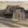 O galpão à esquerda possui aberturas superiores para ventilação e uma chaminé cilíndrica de alvenaria que se projeta verticalmente. O galpão à direita apresenta uma ampla abertura frontal escurecida e uma estrutura de telhado mais elevada. Entre as construções e as pilhas de madeira, notam-se toras brutas espalhadas pelo chão.