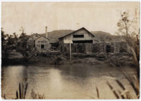 Paisagem Industrial, Sociedade Madereira S.A., Rio do Sul, Santa Catarina, Rio, Corpo d'água, Galpão de Madeira, Arquitetura Industrial, Chaminé, Estoque de Madeira, Tábuas, Toras, Indústria Madeireira, Trabalho e Atividades Econômicas, Produção Fabril, Vale do Itajaí, Patrimônio Industrial, Fotografia Documental, Vegetação Nativa, Morro, Vista dos Fundos