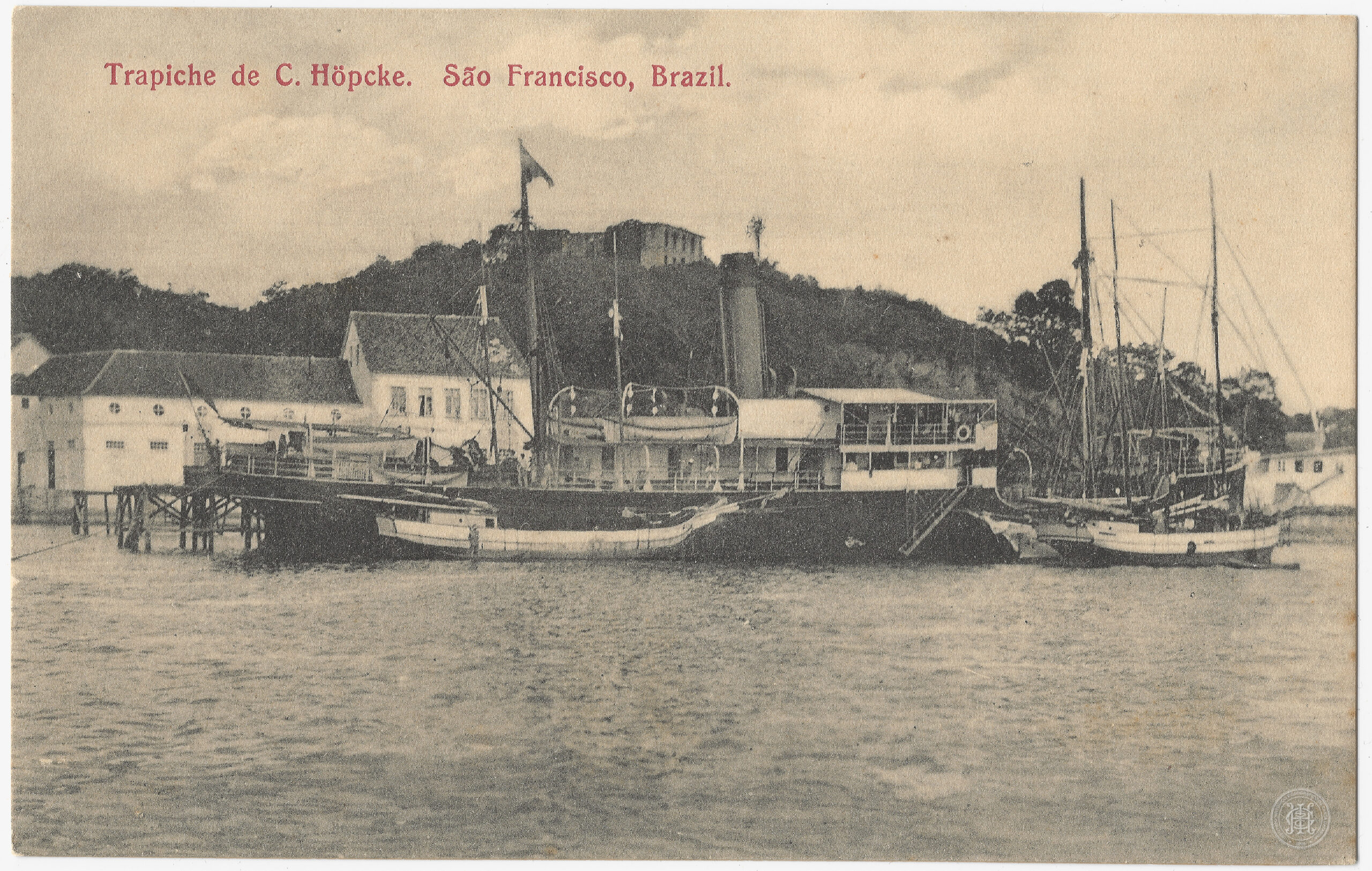 Trapiche da Empresa Carl Hoepcke em São Francisco do Sul, Santa Catarina. Em primeiro plano, observa-se a superfície da Baía de Babitonga com pequenas ondulações. No plano médio, uma grande embarcação a vapor de casco escuro e superestrutura clara está atracada ao trapiche de madeira; ao seu lado, à direita, avista-se um veleiro de dois mastros.